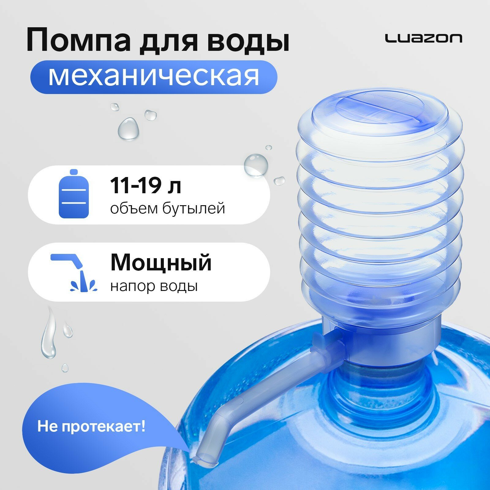 Помпа для воды Luazon, механическая, прозрачная, под бутыль от 11 до 19 л, голубая интересное: