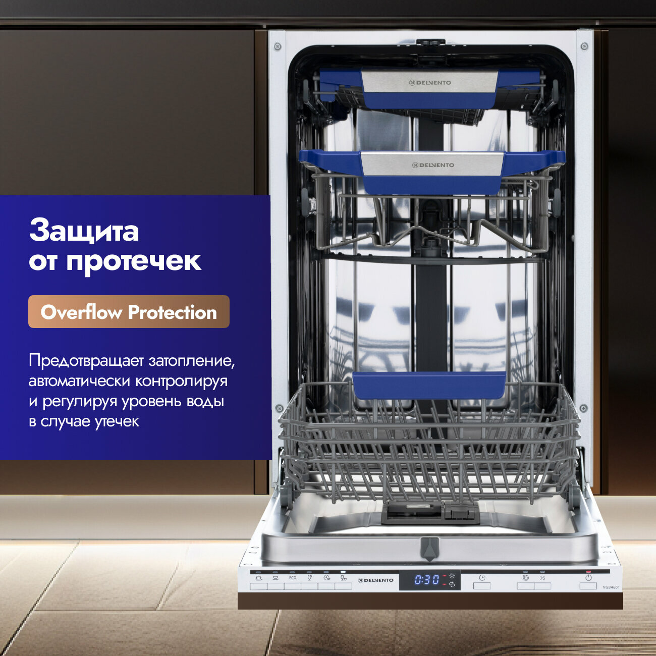 Посудомоечная машина 45 см встраиваемая узкая DELVENTO VGB4600 / 6 программ / 10 комплектов / белый / цифровой дисплей / 2 корзины загрузки / отложенный старт / блокировка от детей / защита от протечек / гарантия 3 года