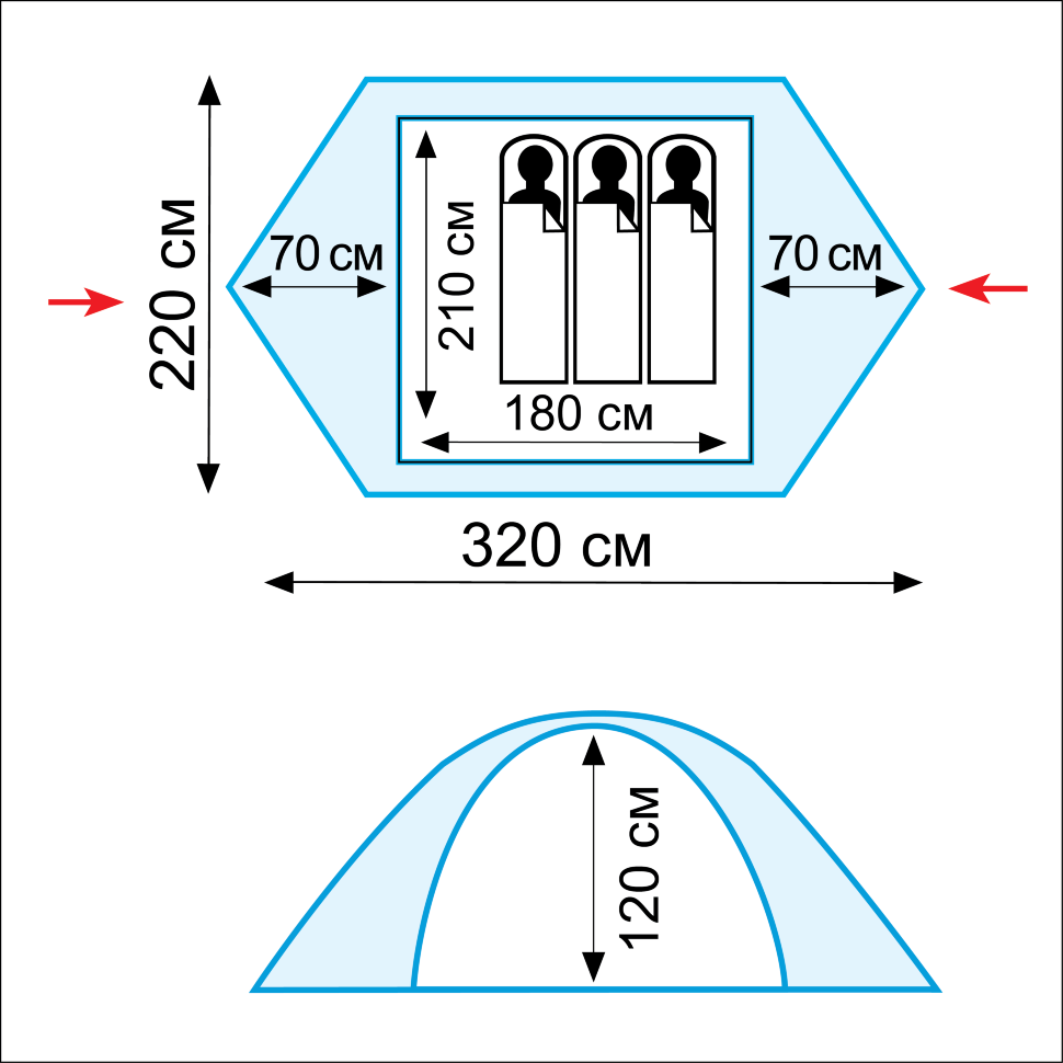 | Габариты внешней палатки(ДxШxВ) | 320x210x120 cм |