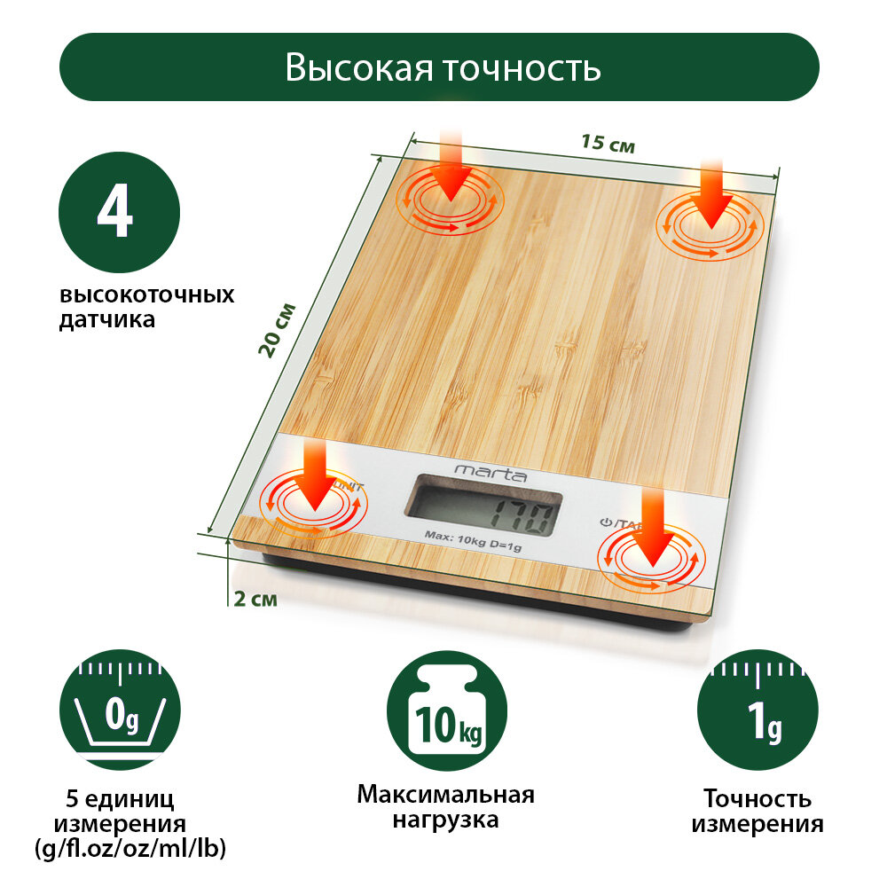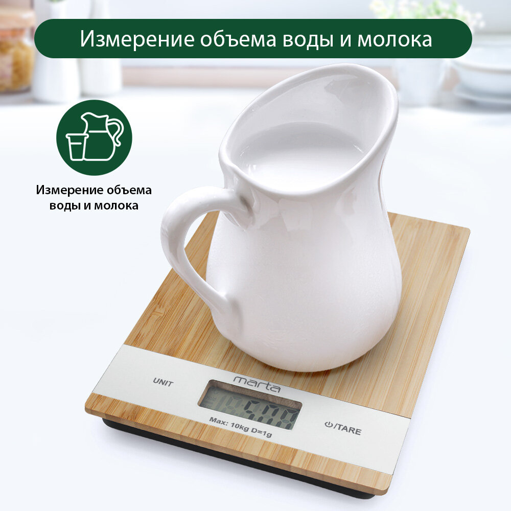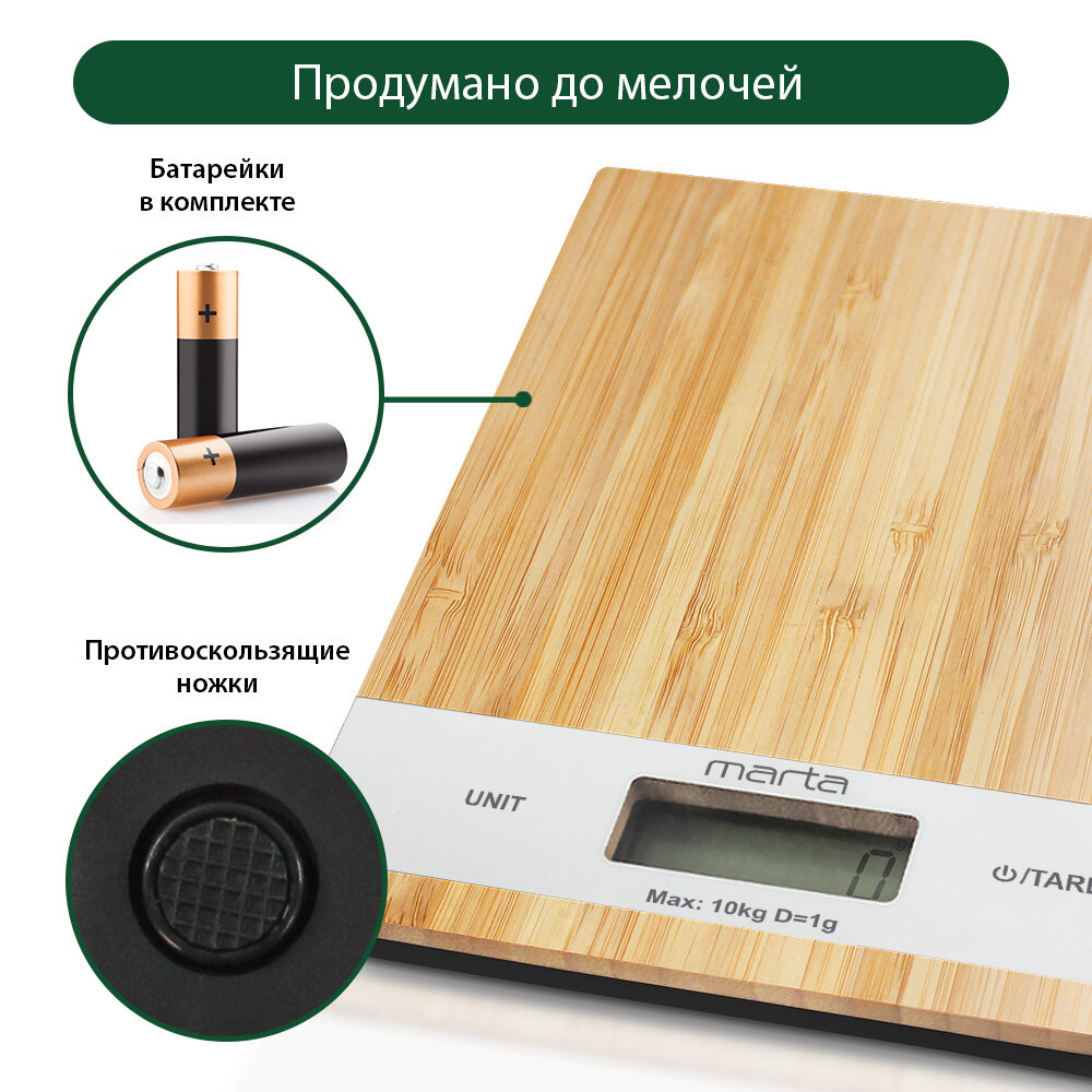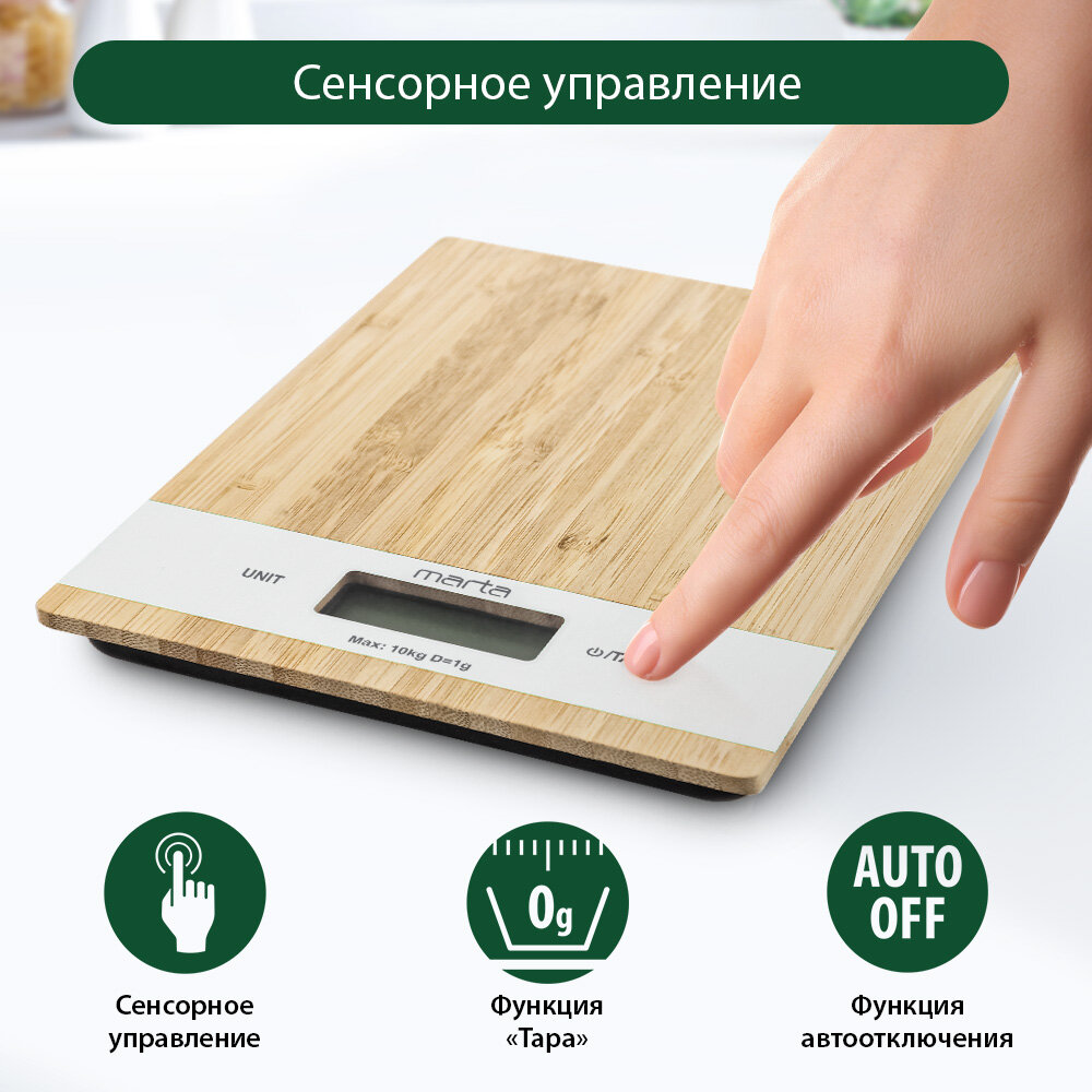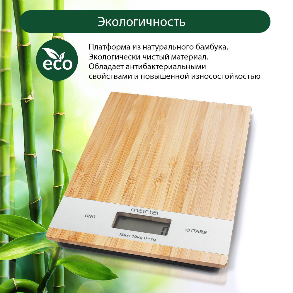 MARTA MT-1639 {new} белый бамбук весы кухонные сенсор, встроенный термометр интересное: