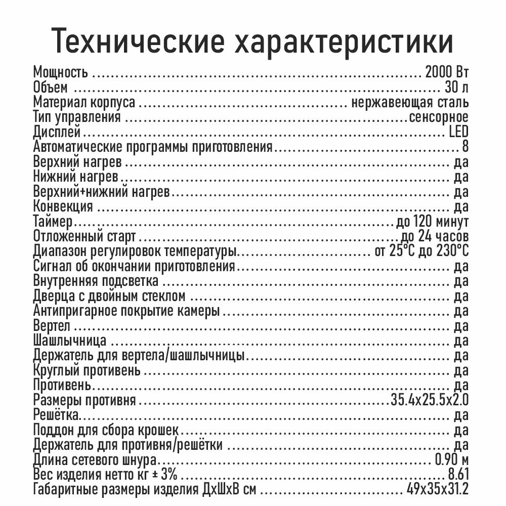 | Режимы | автоматические программы приготовления / конвекция / размораживание |