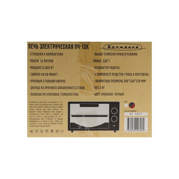 Купить Мини-печь Волжанка ПЧ-12К, 600 Вт, 12 л, 100-230°С, таймер, красно-чёрная