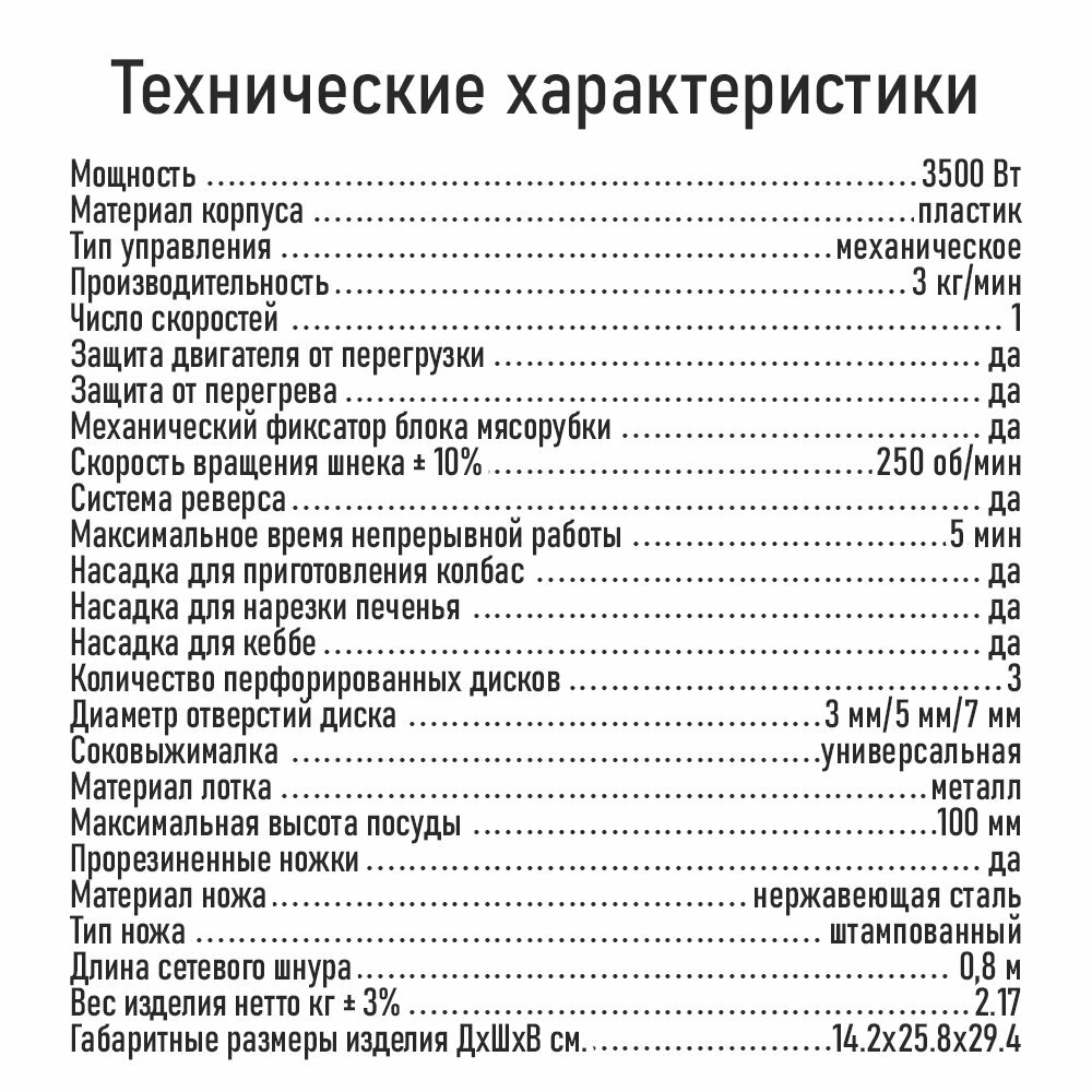 | Насадки | насадка для кеббе / насадка для приготовления колбас / соковыжималка |