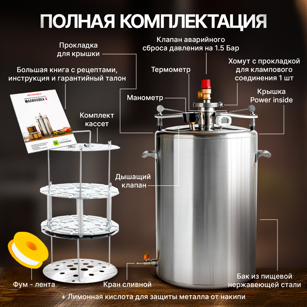 | Подробная комплектация | 1. Бак 42 литра из пищевой нержавеющей стали - 1 шт.; 2. Кассеты - 6 шт.; 3. Крышка Power inside - 1 шт.; 4. Прокладка для крышки - 1 шт.; 5. Перекладина для фиксации крышки - 1шт.; 6. Вентили для перекладины крышки (ручные болты) - 2 шт.; 7. Клапан аварийного сброса давления на 3 Бар. - 1 шт.; 8. Кран сливной - 1 шт.; 9. Хомут для клампового соединения - 1 шт.; 10. Термометр - 1 шт.; 11. Манометр - 1 шт.; 12. Инструкция - 1 шт.; 13. Гарантийный талон - 1 шт. |
