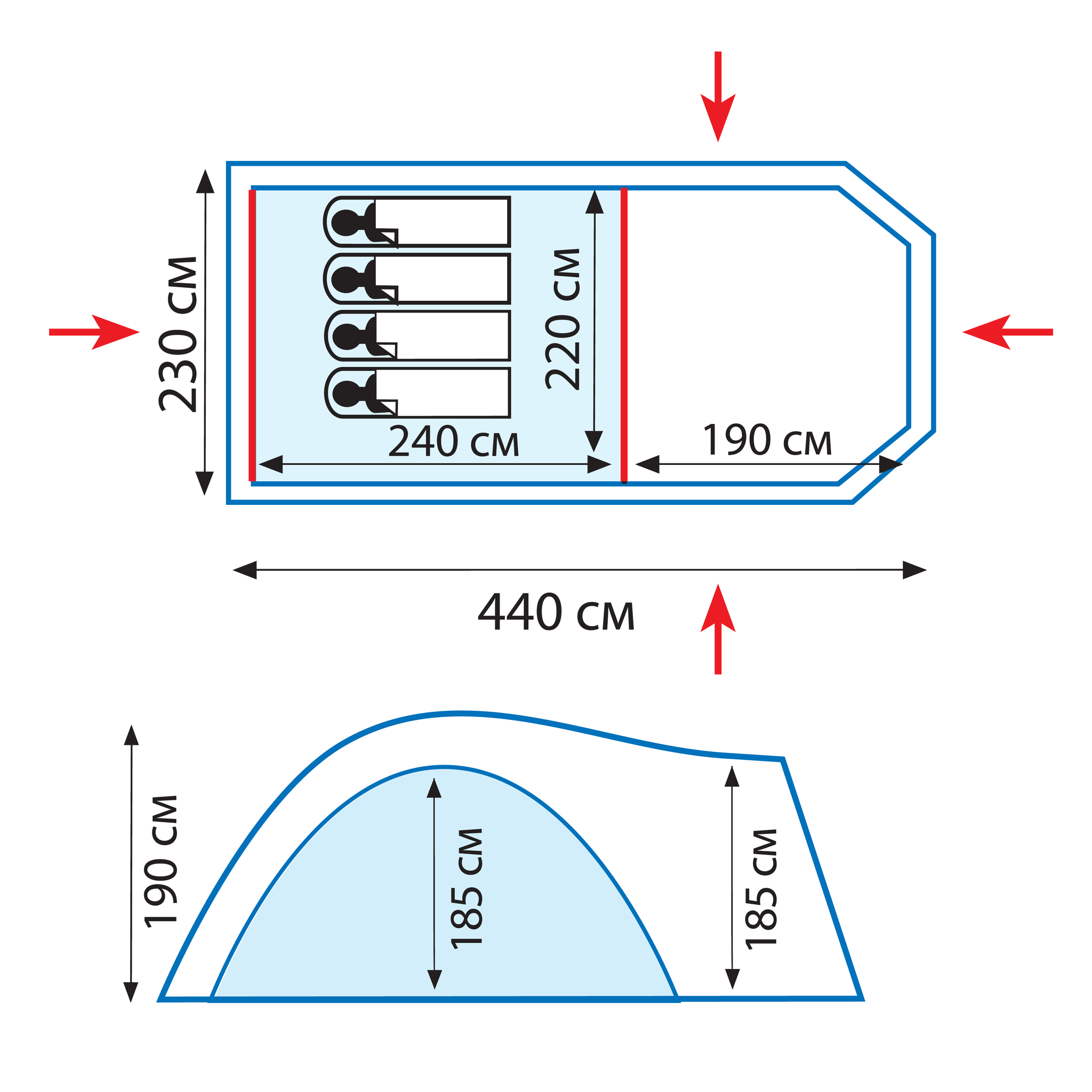 | Габариты внешней палатки(ДxШxВ) | 440x230x190 cм |