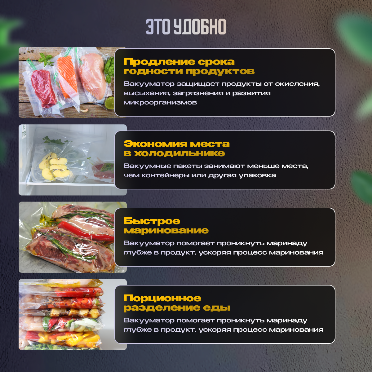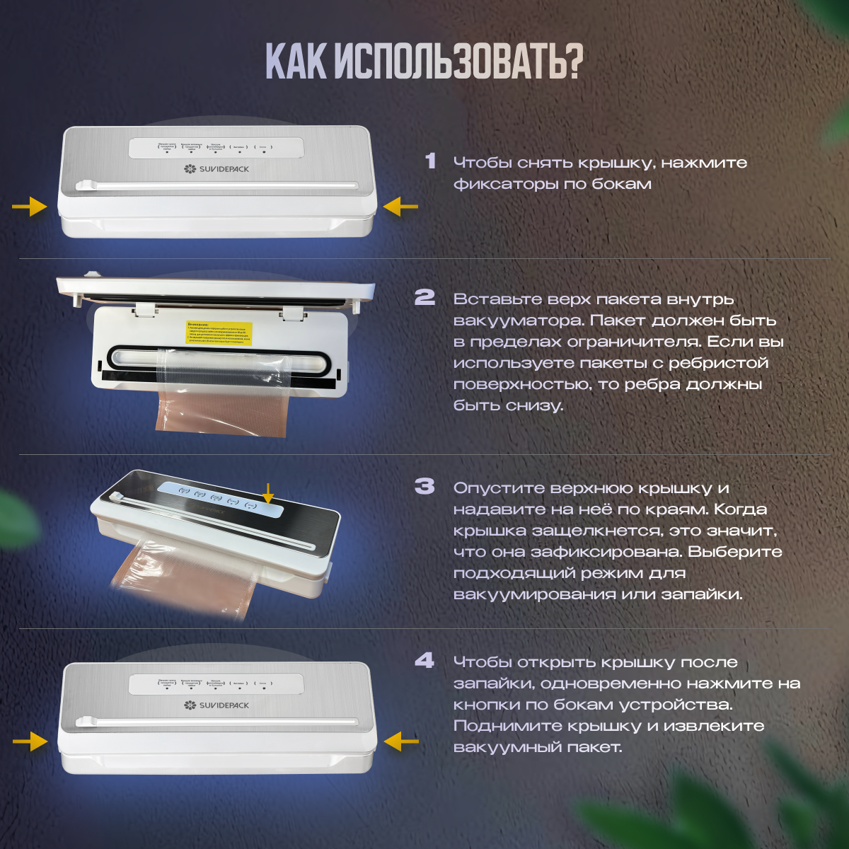 | Назначение | вакуумирование / маринование / упаковка |