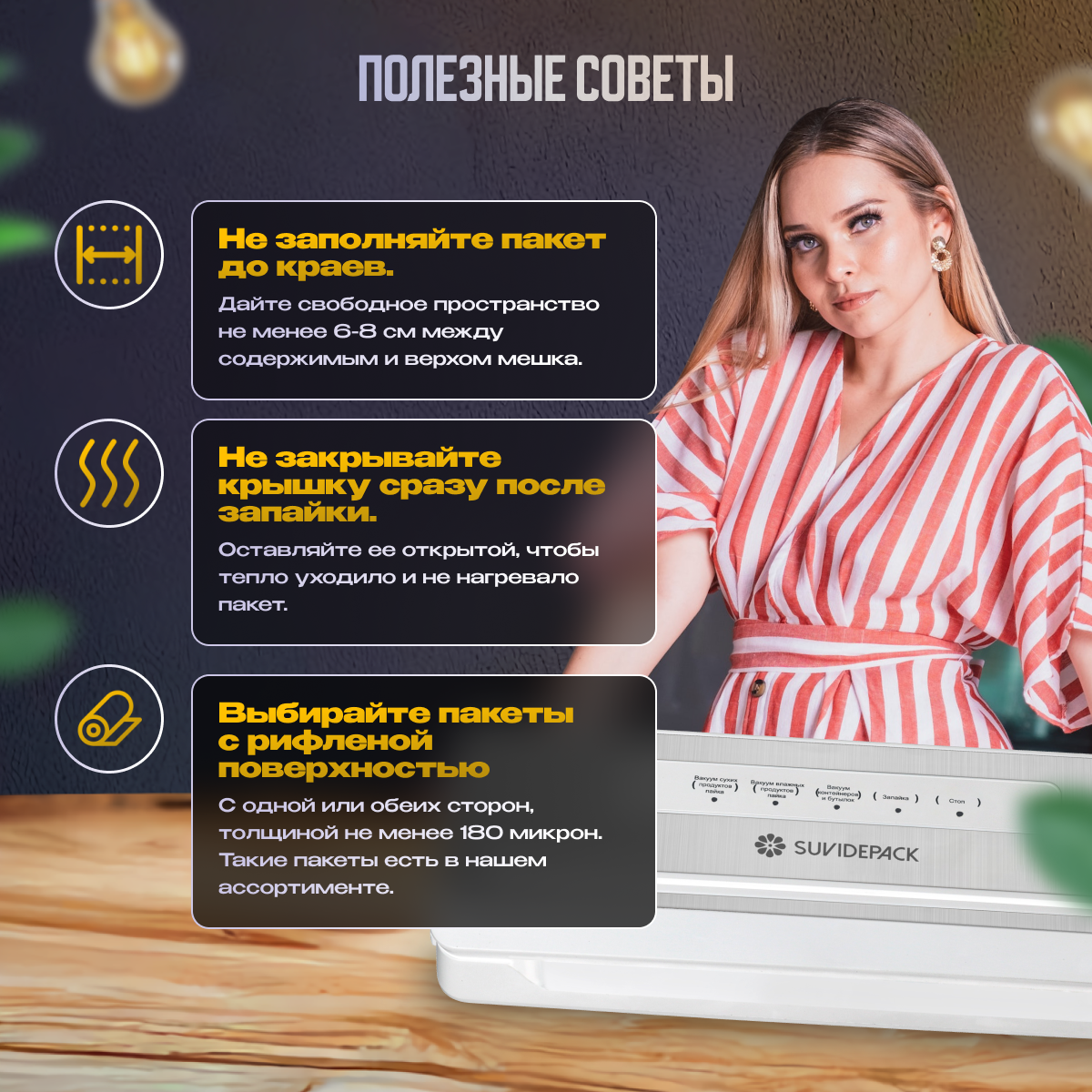 | Подробная комплектация | Вакуумный упаковщик, кабель питания, пробка для вакуумации бутылок, силиконовый шланг для внешнего вакуума, инструкция на русском языке, пакеты 10 штук |