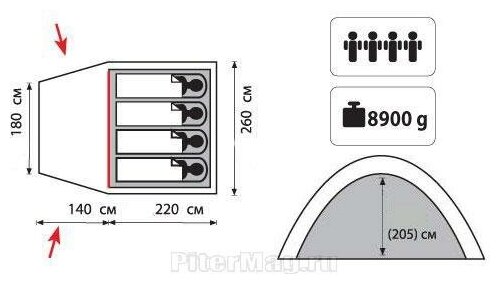 | Габариты внешней палатки(ДxШxВ) | 365x260x205 cм |