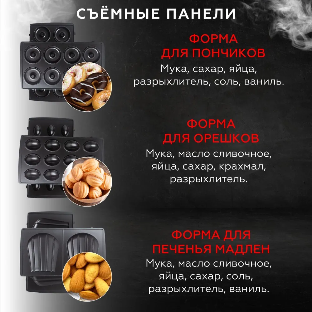 | Вид панели | вафли / выпечка и печенье / гриль / омлет / орешки / пончики / сырники / сэндвичи |