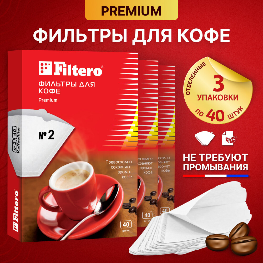 Комплект фильтров для кофе, кофеварки и кофемашин Filtero Premium №2, белые, 40штук