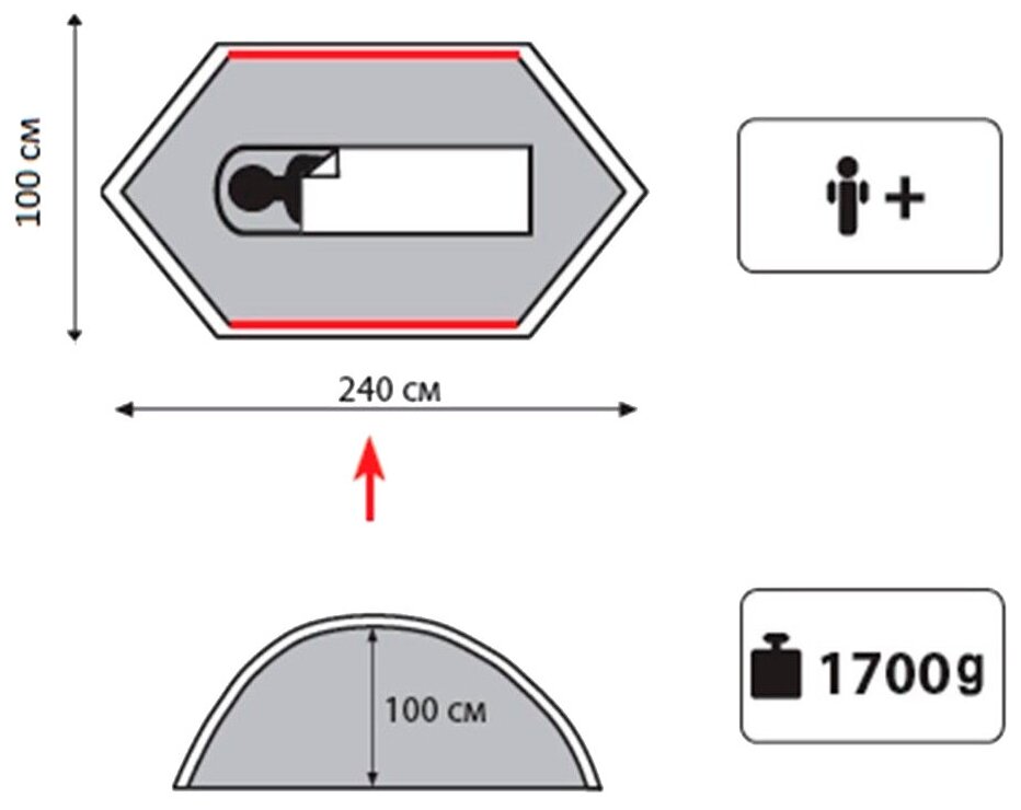 | Минусы: | Очень тесная. Да, это конечно однушка, "велосипедка", но палатка совсем без тамбура, это неудобно. Если вы плечистый человек - будет тесно, если у вас крупный рюкзак - спать с ним придется в обнимку. |