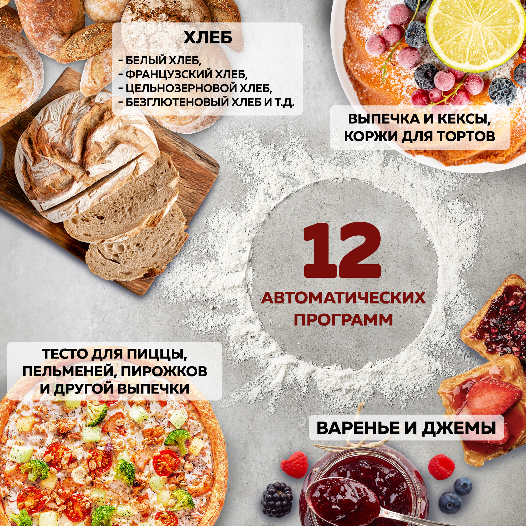 | Программы | безглютеновая выпечка / варенье / замес теста / белый хлеб / Быстрый хлеб / Выпечка / сладкий хлеб / торт / Тостовый хлеб / ультрабыстрый хлеб / Французский хлеб / цельнозерновои? хлеб |