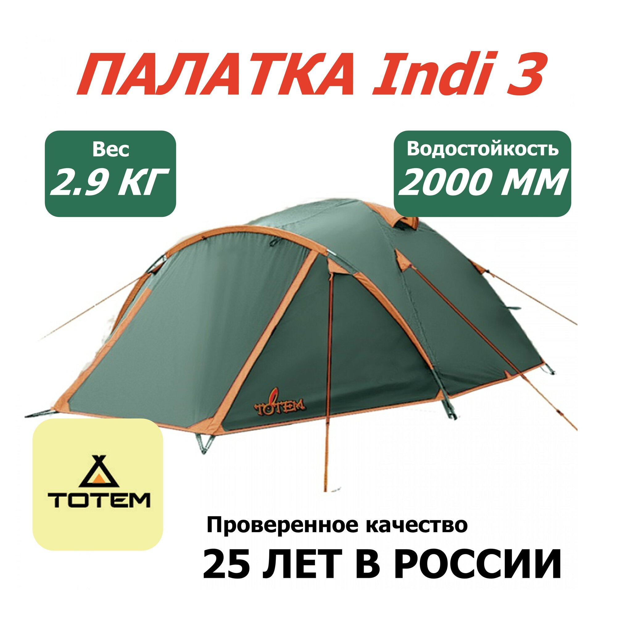Палатка Totem "Indi 3 V2", TTT-018, 3-местная, двухслойная, 2000/10000 мм, каркас 7.9 мм, вес 2.9 кг, зеленая