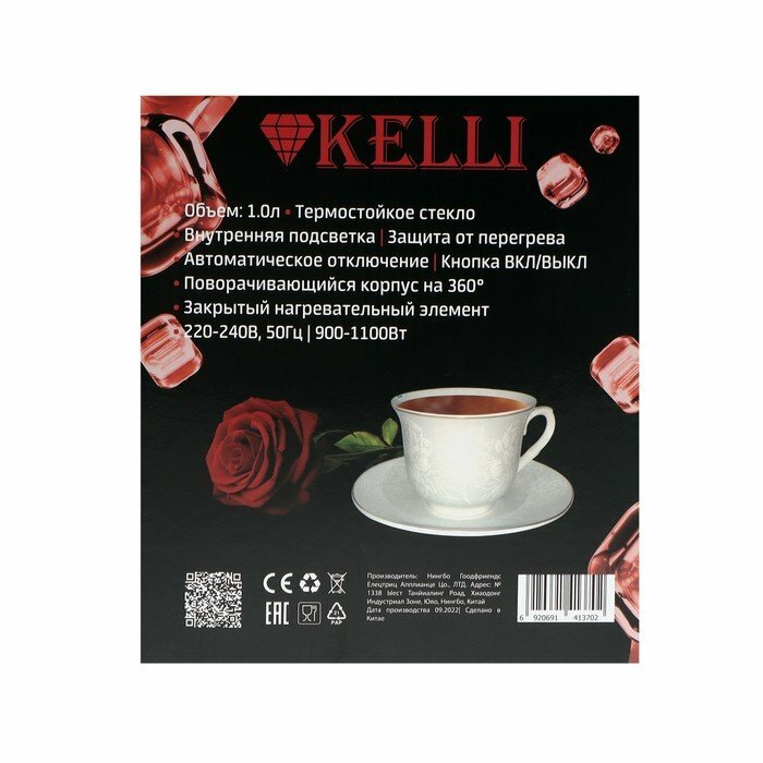 Kelli Чайник электрический KELLI KL-1370, стекло, 1 л, 1100 Вт, чёрный