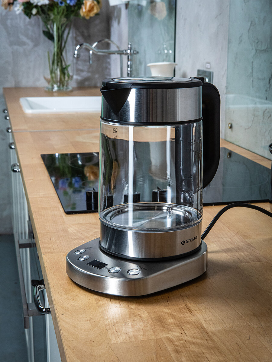 Чайник электрический Gressel GRK-1102 с регулировкой температуры, стеклянный с подсветкой, 1.7л, STRIX-контроллер интересное:
