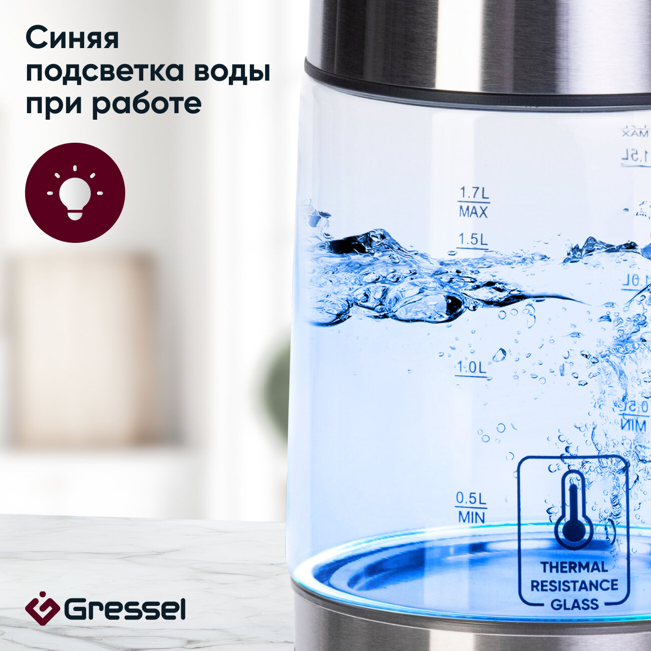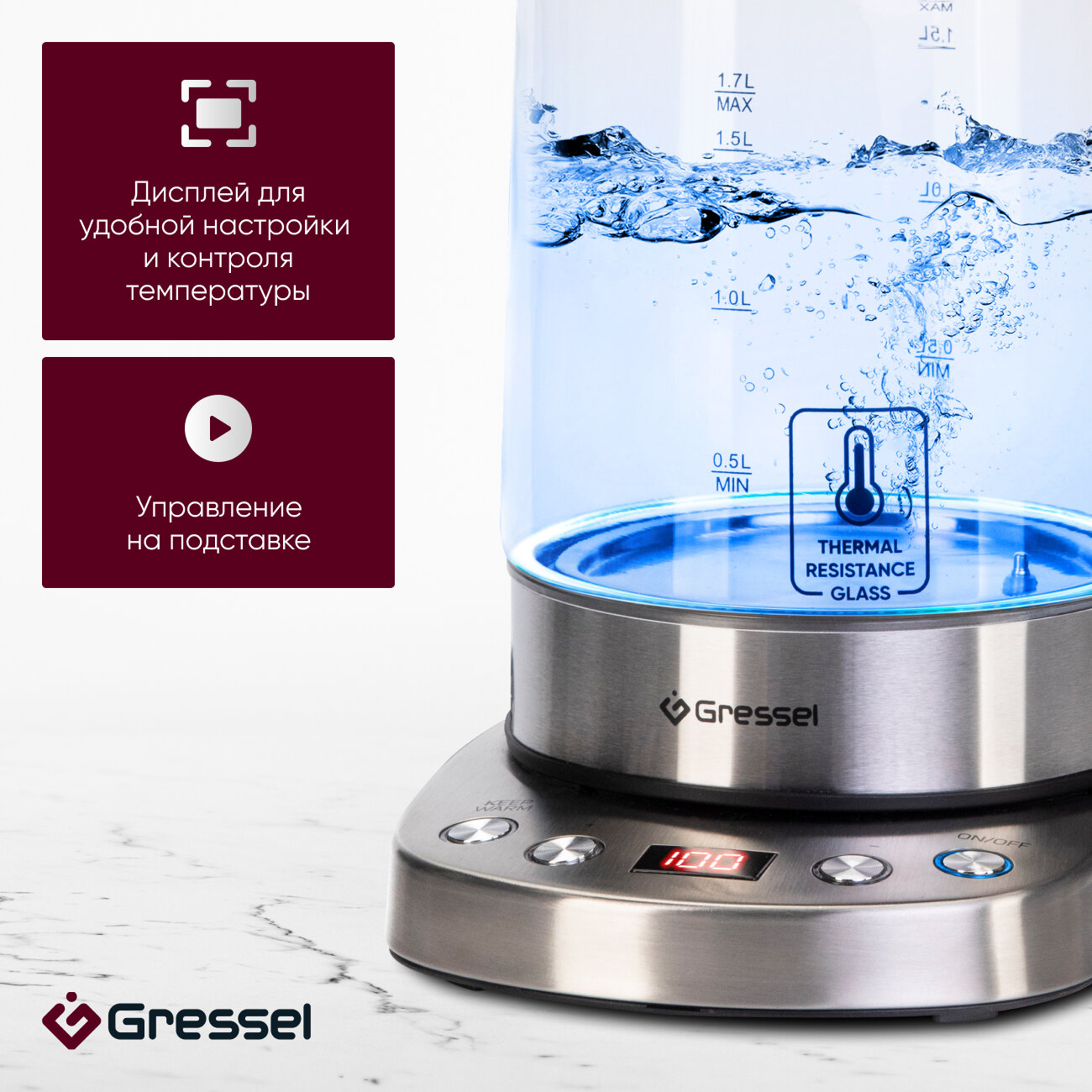 Купить Чайник электрический Gressel GRK-1102 с регулировкой температуры, стеклянный с подсветкой, 1.7л, STRIX-контроллер