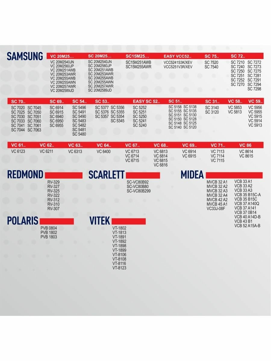 | Производитель совместимого пылесоса | Daewoo, Midea, Polaris, REDMOND, Samsung, Scarlett, VITEK |