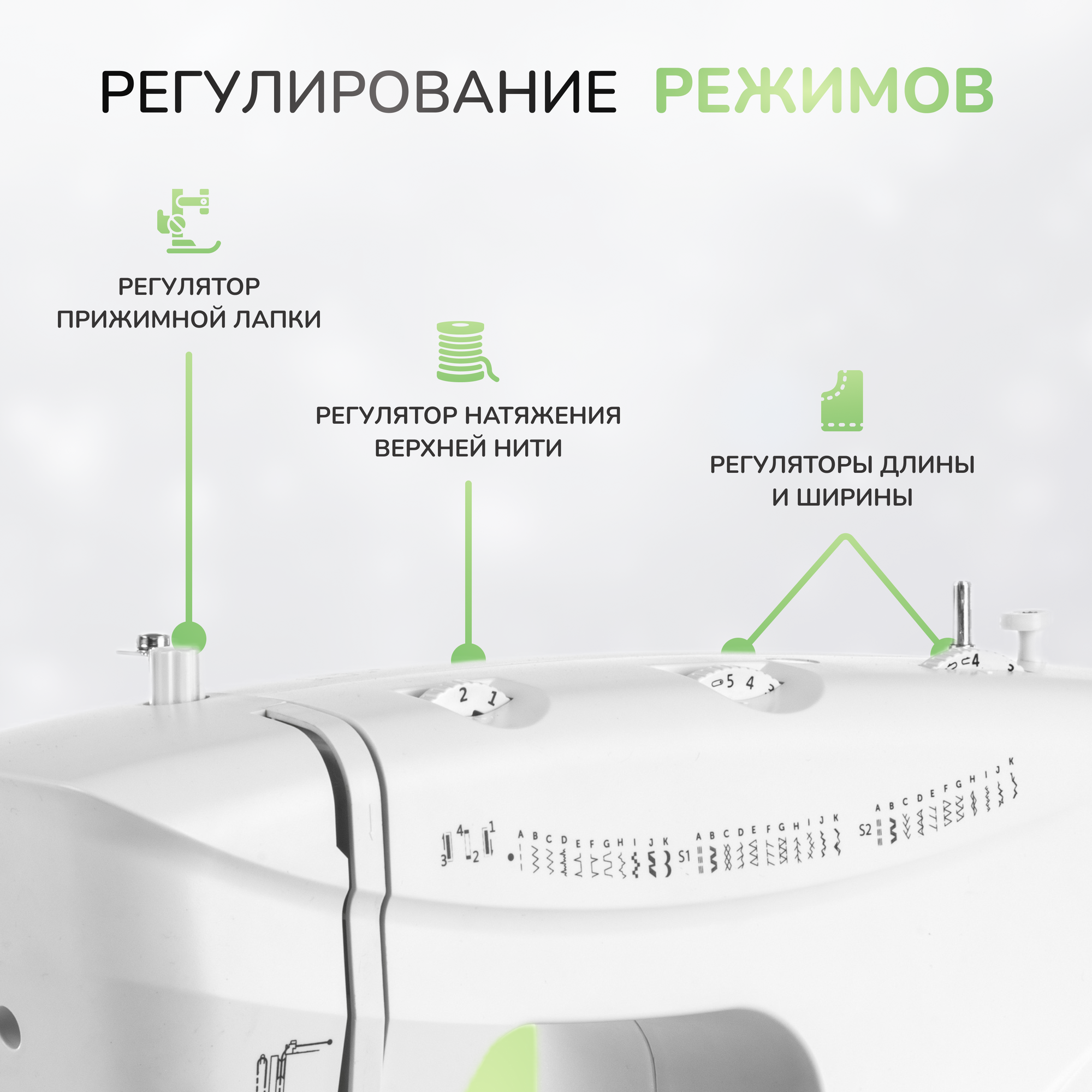 | Дополнительные функции | кнопка реверса, отключение механизма подачи ткани, регулировка давления лапки на ткань |