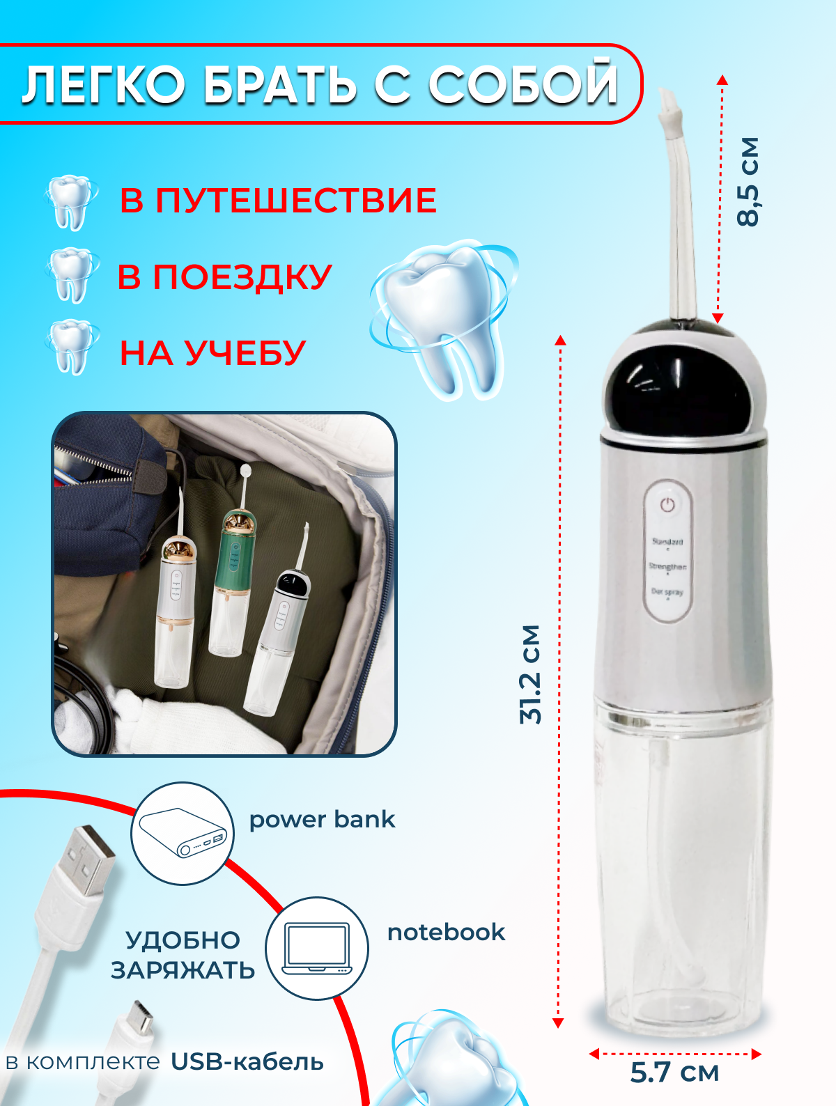 | Подробная комплектация | Ирригатор портативный с ёмкостью 230 мл usb-провод для зарядки насадка для чистки языка пародонтическая насадка универсальная насадка ортодонтическая насадка. |