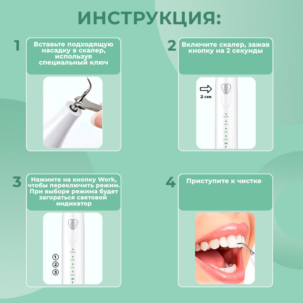 | Подробная комплектация | Электрическая зубная щетка, 3 сменные насадки, чехол для электрощетки, инструкция, USB переходник, Коробка, ультразвуковой скалер, 4 наконечника, ключ для смены наконечников, стоматологическое зеркало, инструкция, зарядное устройство Type-C |