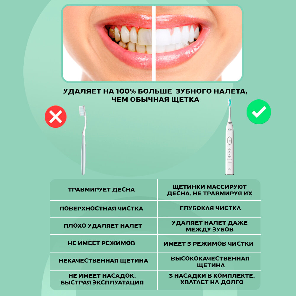 | Режимы | деликатная чистка, ежедневная чистка, массаж, отбеливание, уход за деснами, чистка языка |
