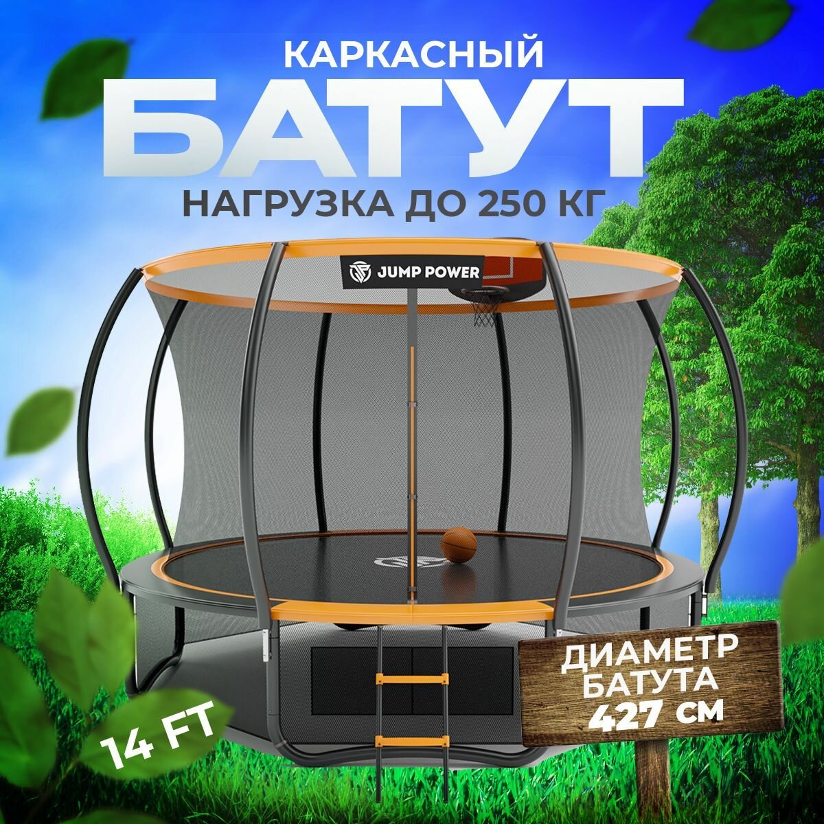 Батут с защитной сеткой Jump Power 427 см 14 ft оранжевый / детский / уличный / для взрослых / для детей / для улицы / для дачи / батут каркасный большой интересное: