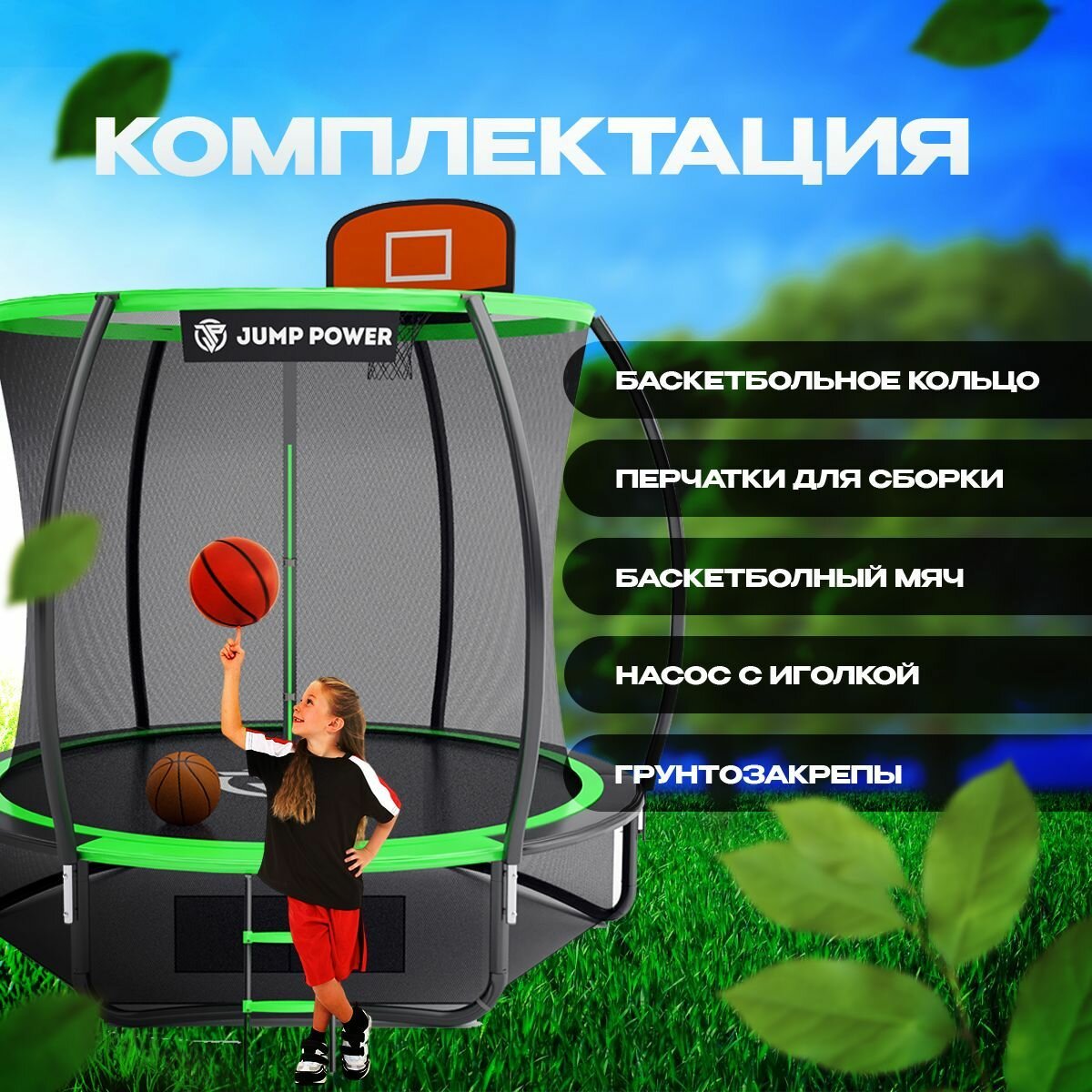| Состав набора | батут, инструмент для сборки, перчатки для сборки, баскетбольное кольцо, мячик, насос для мячика, грунтозакрепы, нижняя защитная сетка с карманами для обуви, Цветная инструкция |