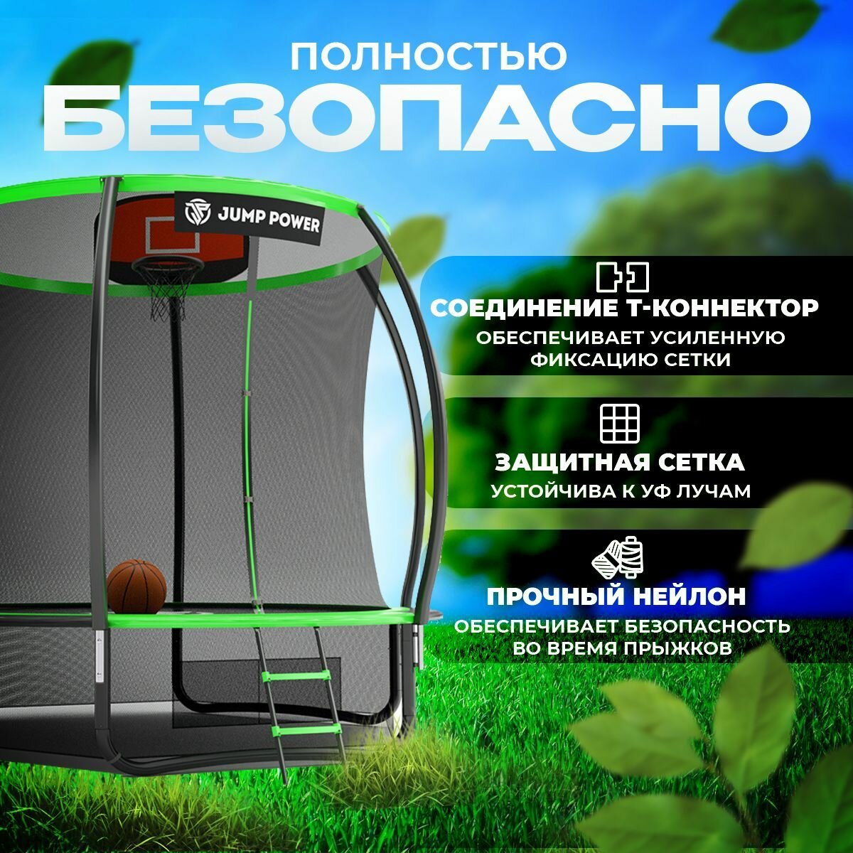 Батут с защитной сеткой Jump Power 427 см 14 ft зеленый / детский / уличный / для взрослых / для детей / для улицы / для дачи / батут каркасный большой интересное: