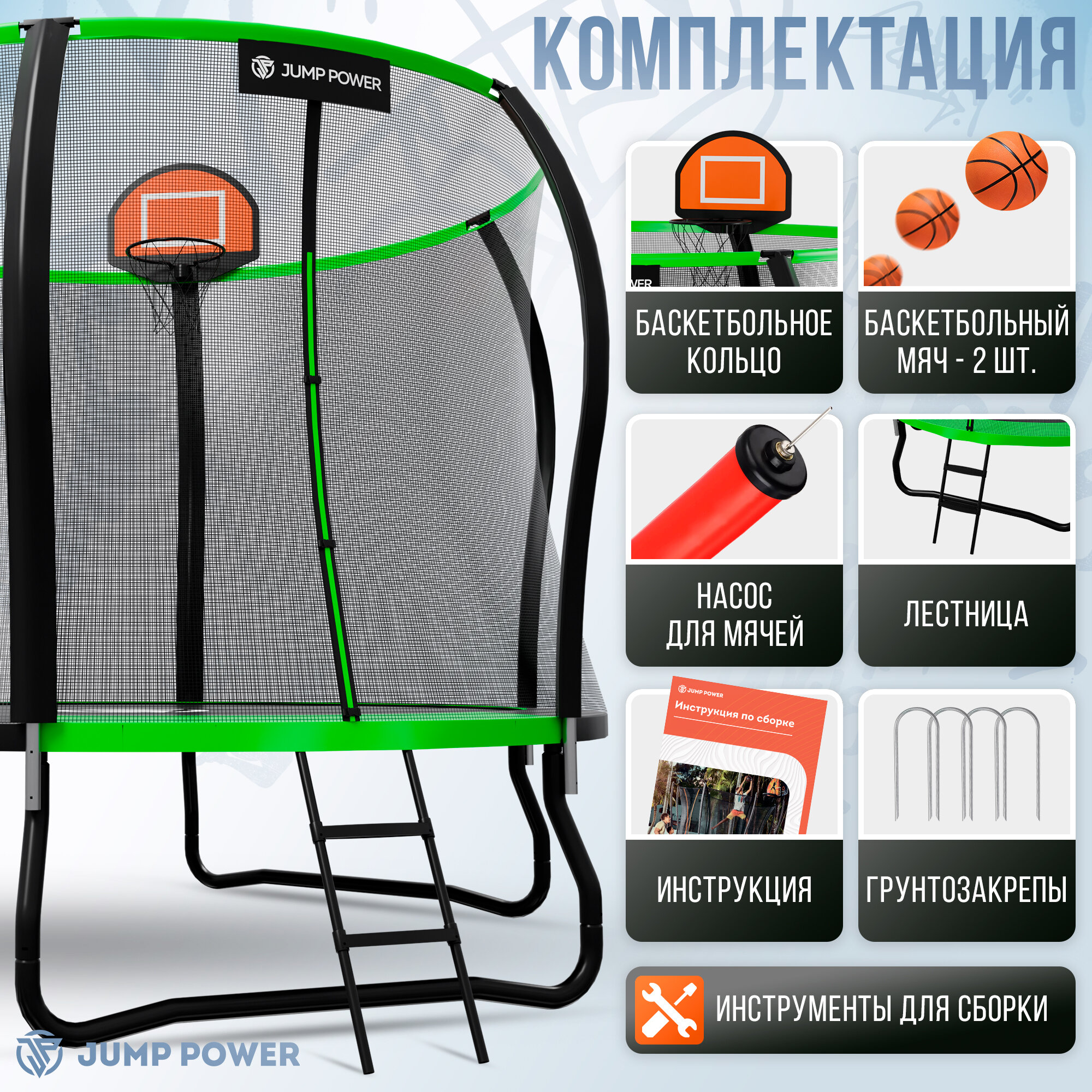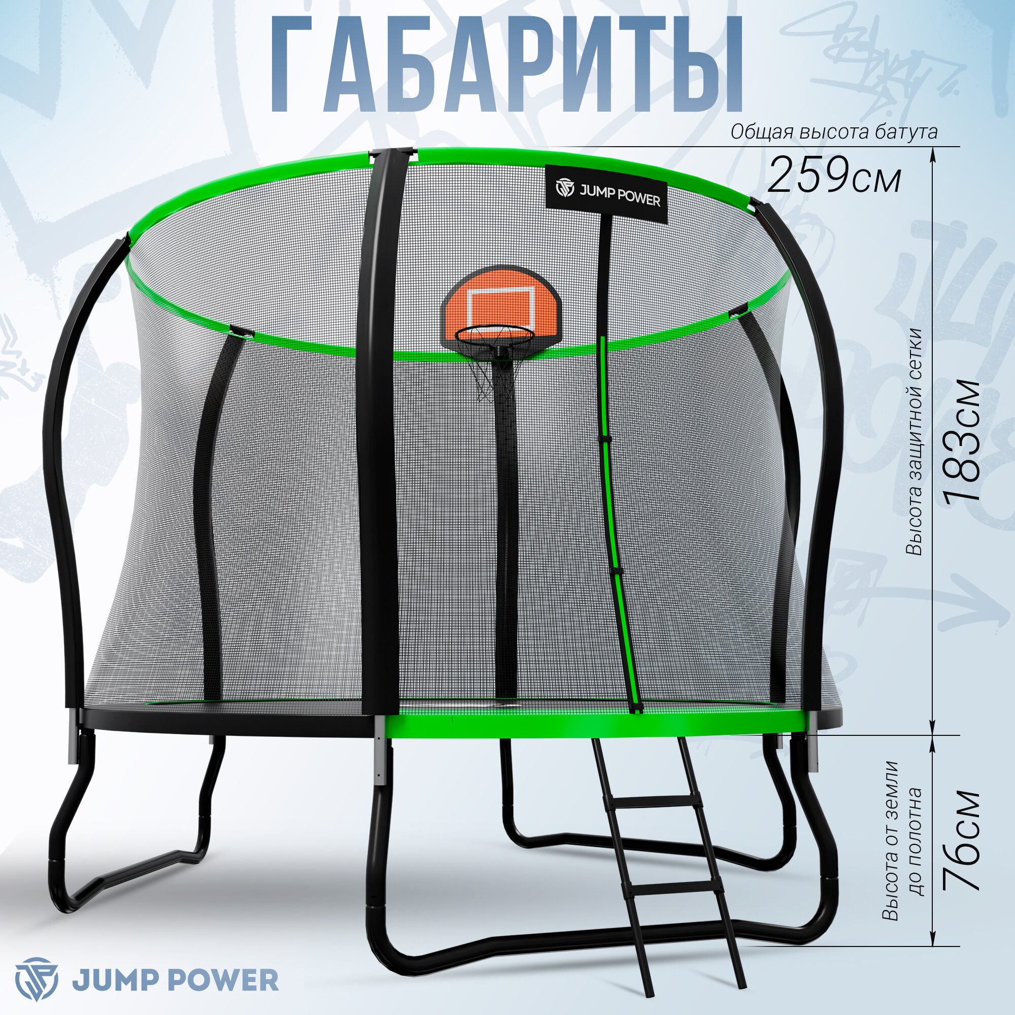 Батут каркасный детский Jump Power 306 см с защитной сеткой для детей/баскетбольное кольцо+мяч/ максималь6ная нагрузка 150кг