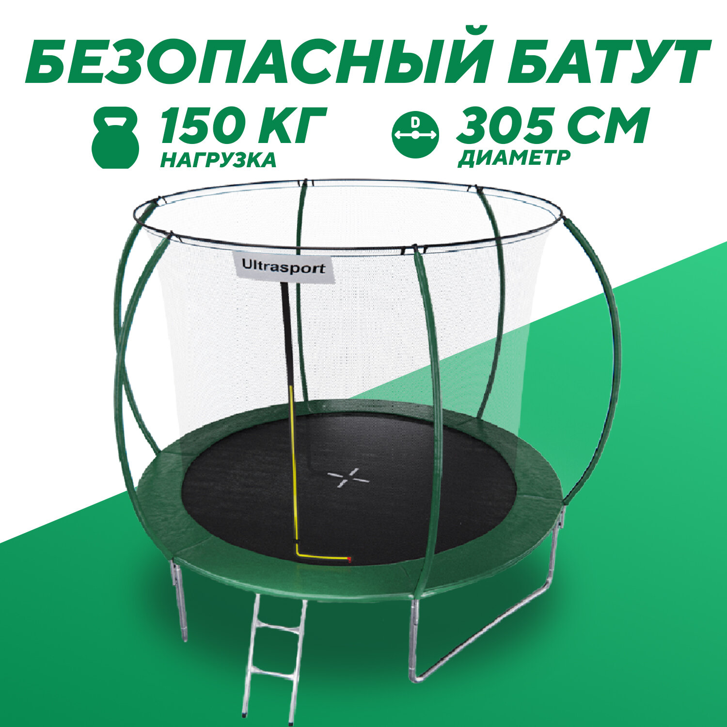 Батут каркасный DFC ULTRASPORT 10 ft с внутренней сеткой, лестница в комплекте, зеленый, 305 см, нагрузка 150 кг.