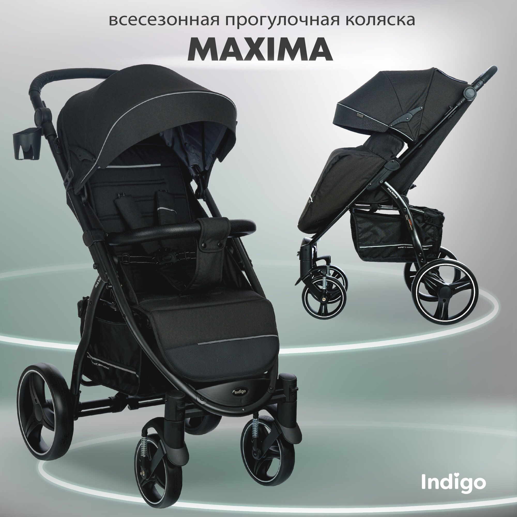 Коляска прогулочная детская MAXIMA (INDIGO), съемный бампер, цвет черный
