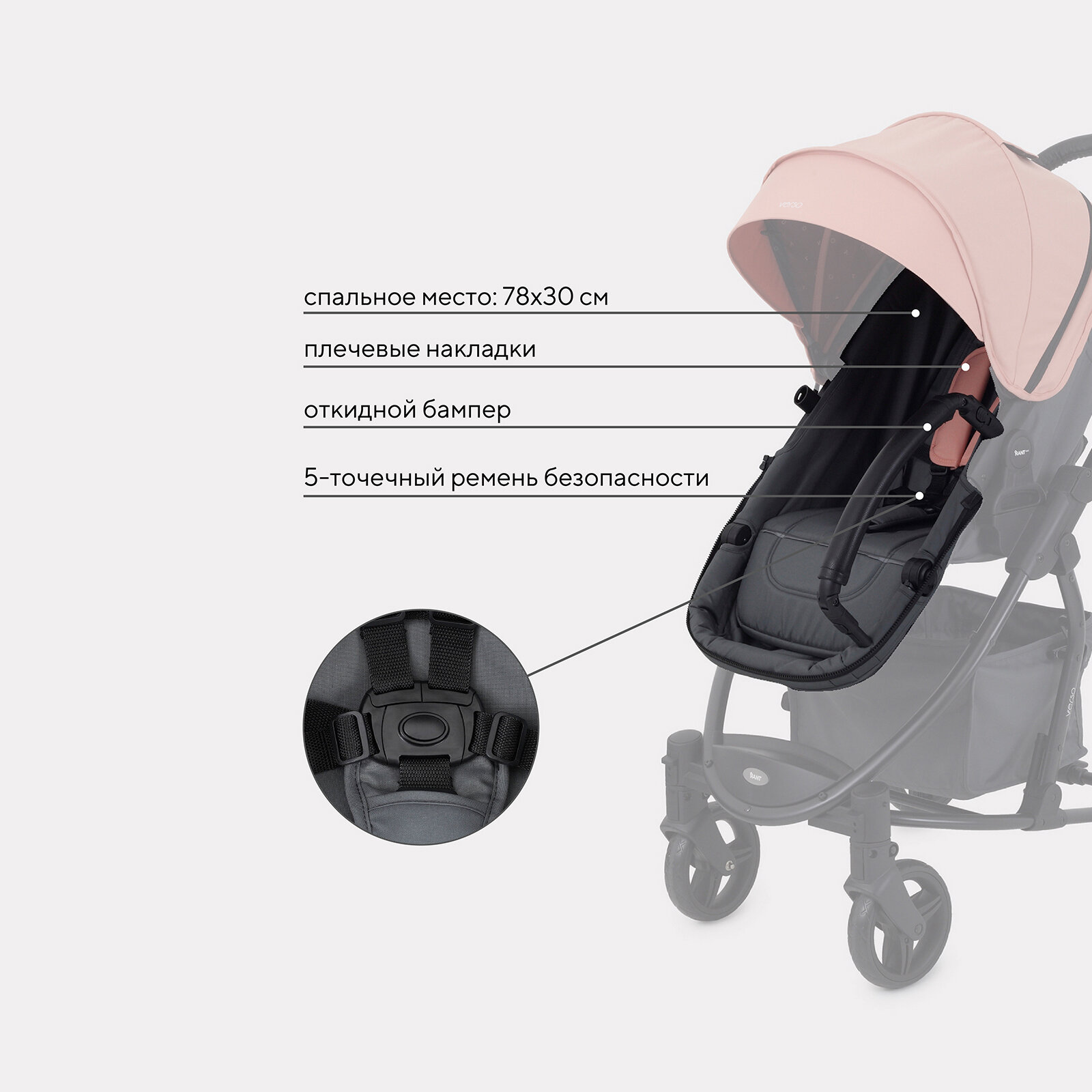 | Особенности | бампер, мягкие накладки на ремни, регулировка наклона спинки, ремни безопасности, смотровое окно |