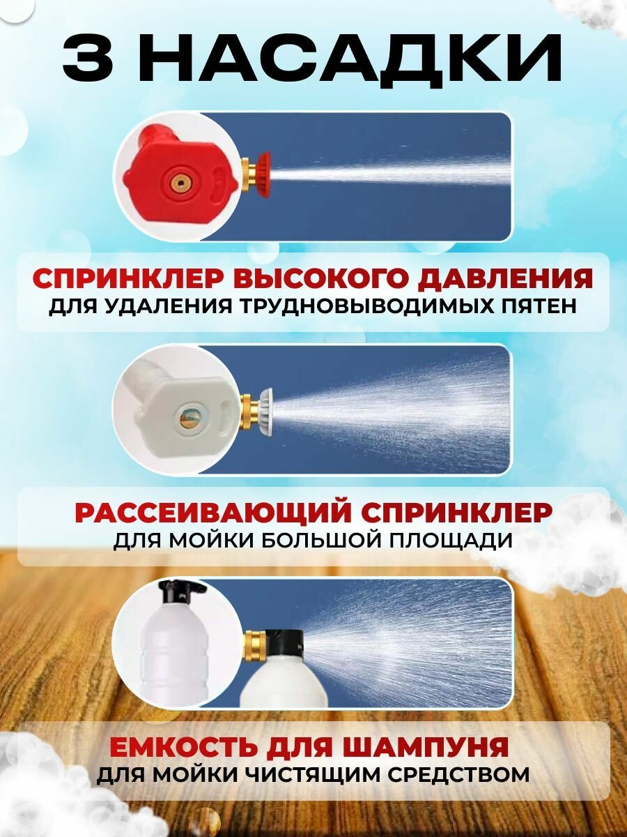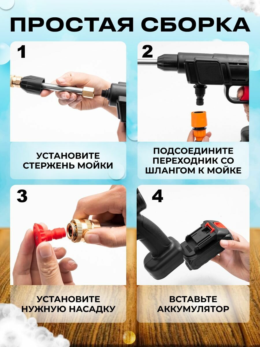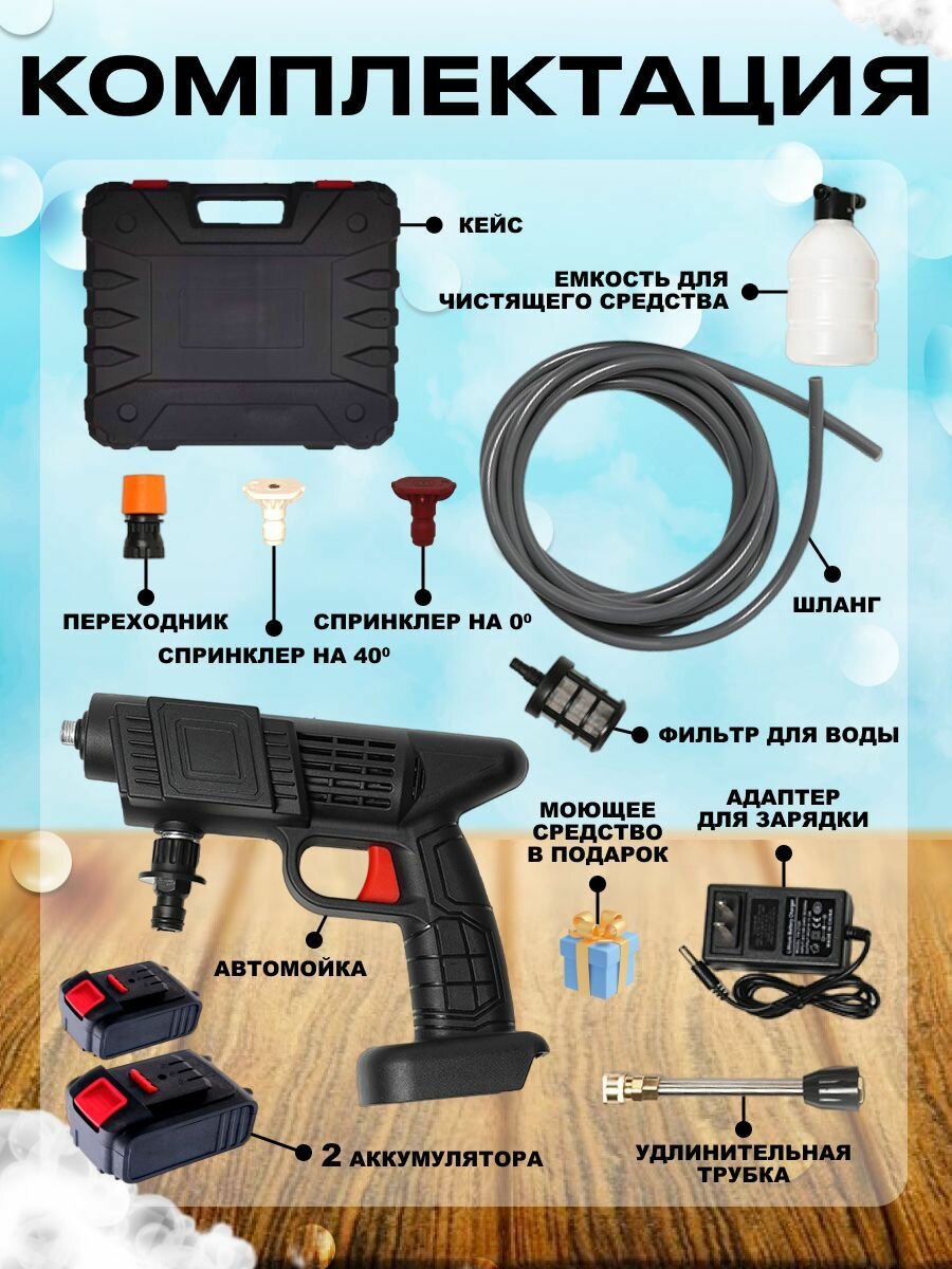 | Подробная комплектация | автомойка 1шт, акб 1шт, зарядное устройство для аккумулятора 1шт, водозаборный шланг 1шт, контейнер для моющего средства 1шт, инструкция 1шт, насадки |