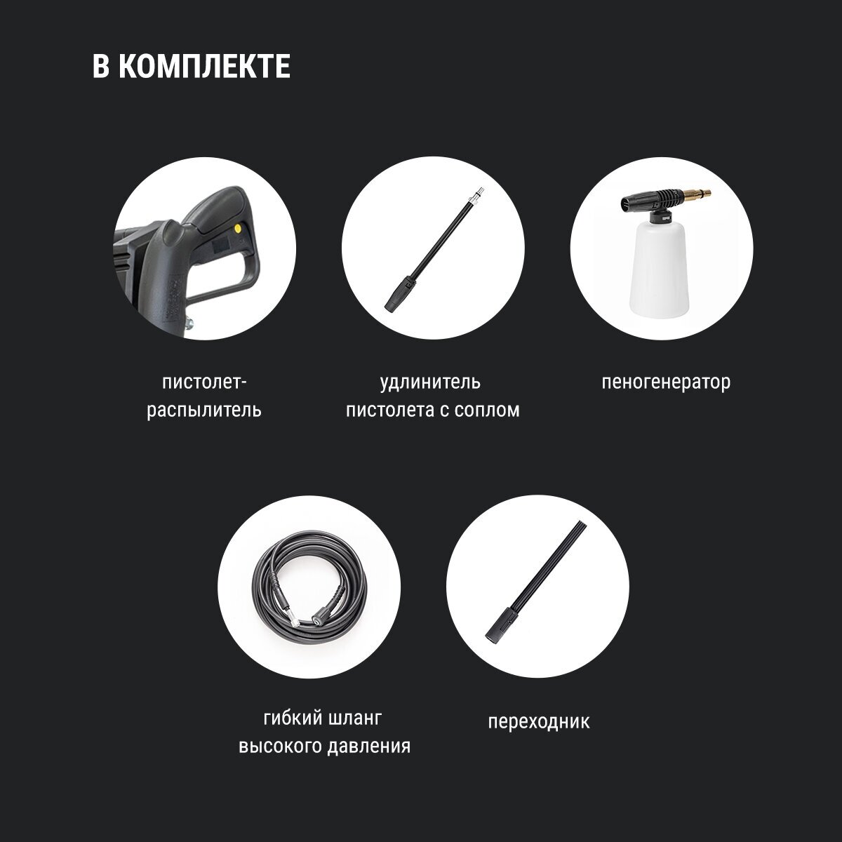 | Подробная комплектация | пистолет-распылитель, удлинитель пистолета с соплом, гибкий шланг высокого давления, пеногенератор, переходник |