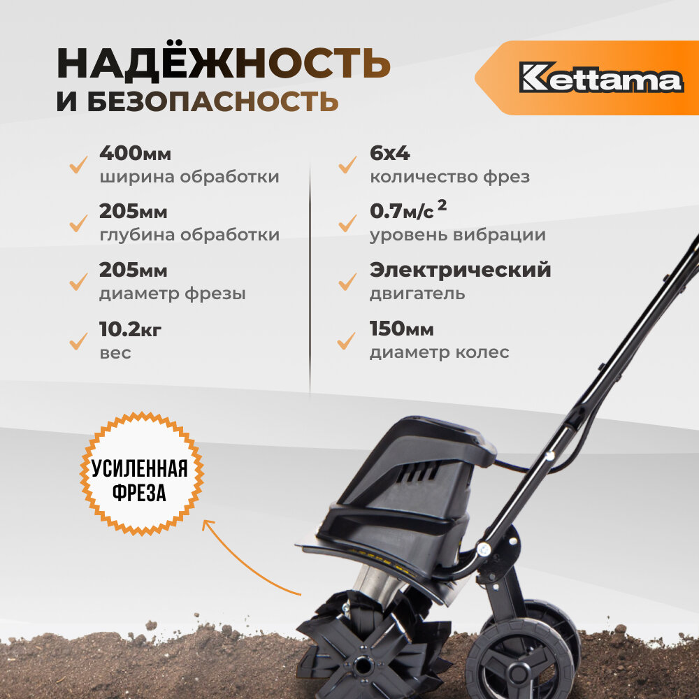 Электрокультиватор Kettama ECO, 1000Вт, глубина вспашки 22см, ширина обработки 36см