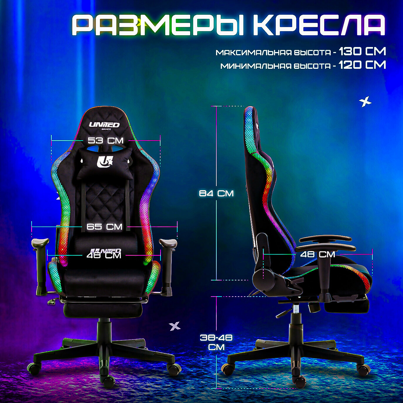 Кресло компьютерное UNITED GAMER BLACK LIGHT, RGB-подсветка, подставка для ног, черный велюр интересное: