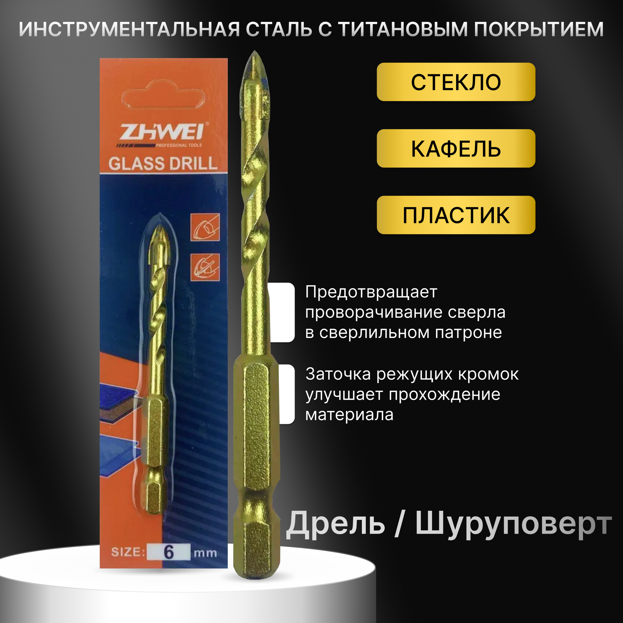 Сверло по стеклу и керамике четырехгранное 6мм ZHWEI , Шестигранный хвостик интересное: