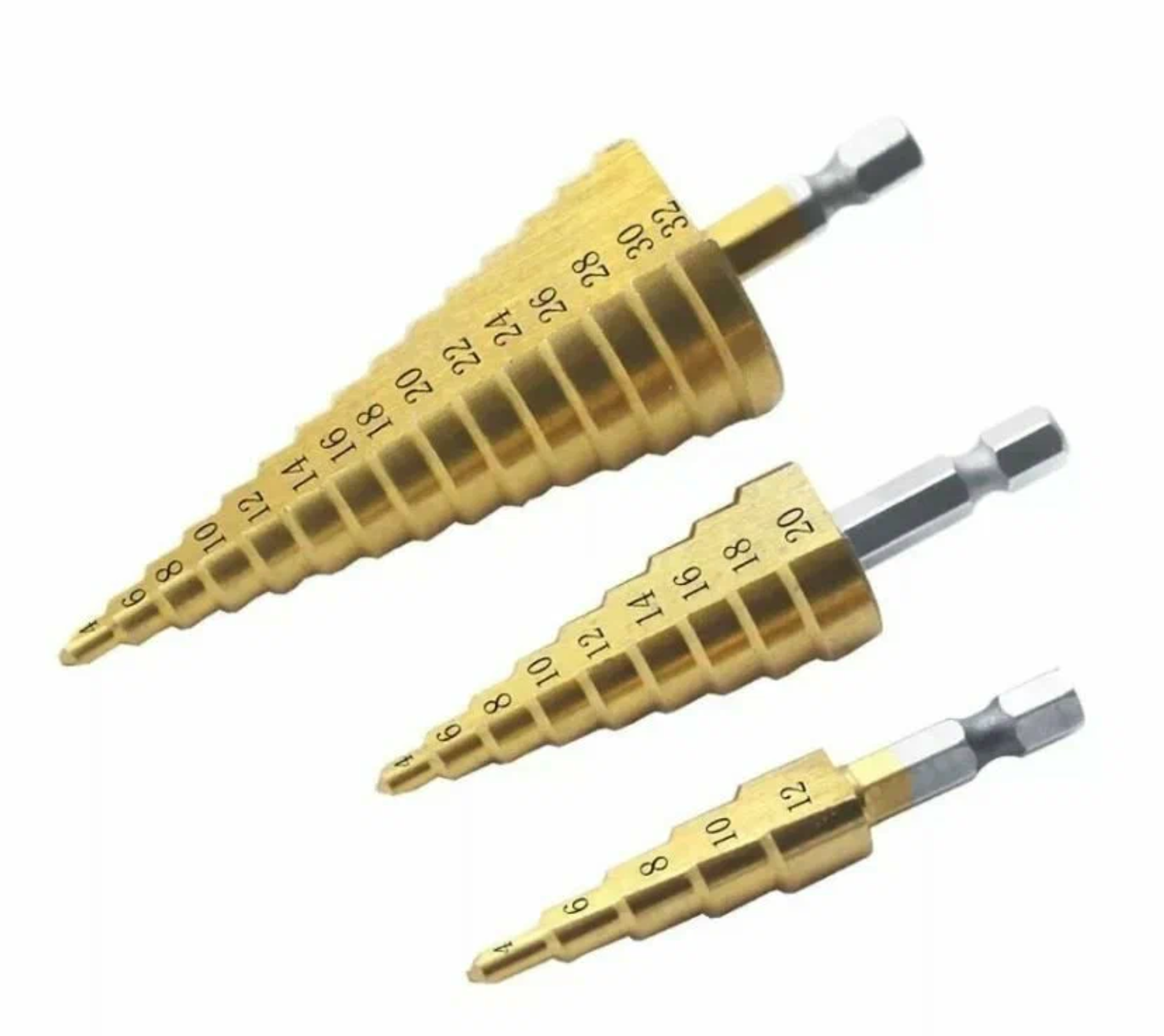 Набор ступенчатых сверл abc с титановым покрытием 3шт (4-12мм, 4-20мм, 4-32мм) интересное: