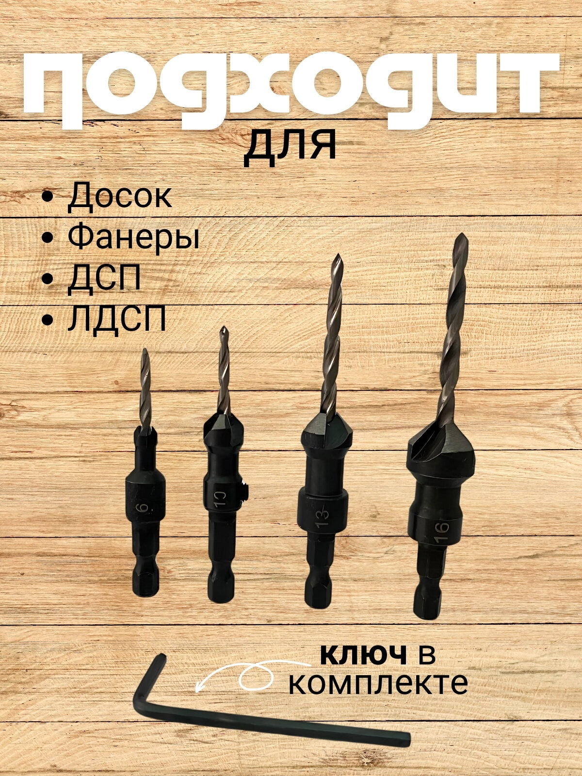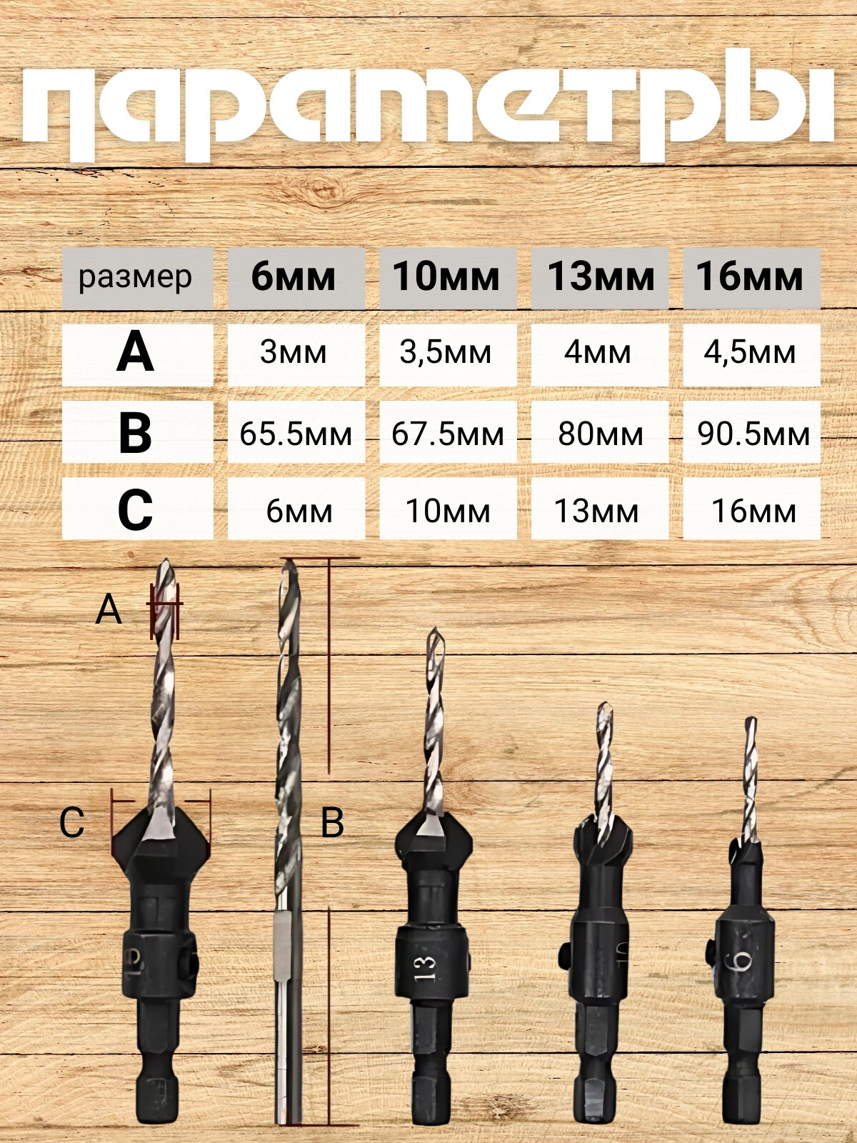 Сверло с зенкером шестигранный хвостовик Набор 4 штуки ( 6 / 10 / 13 / 16 мм ) Зенкер по дереву интересное: