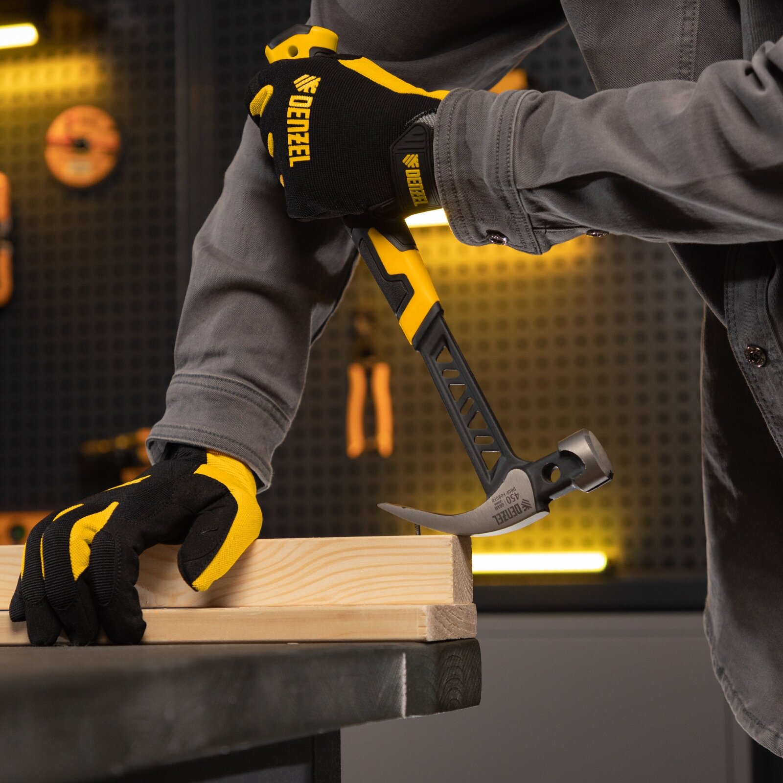 Молоток-гвоздодер Denzel 450 г, цельнокованый, боек с магнитом, двухкомп. обрезин. рук-ка 10466