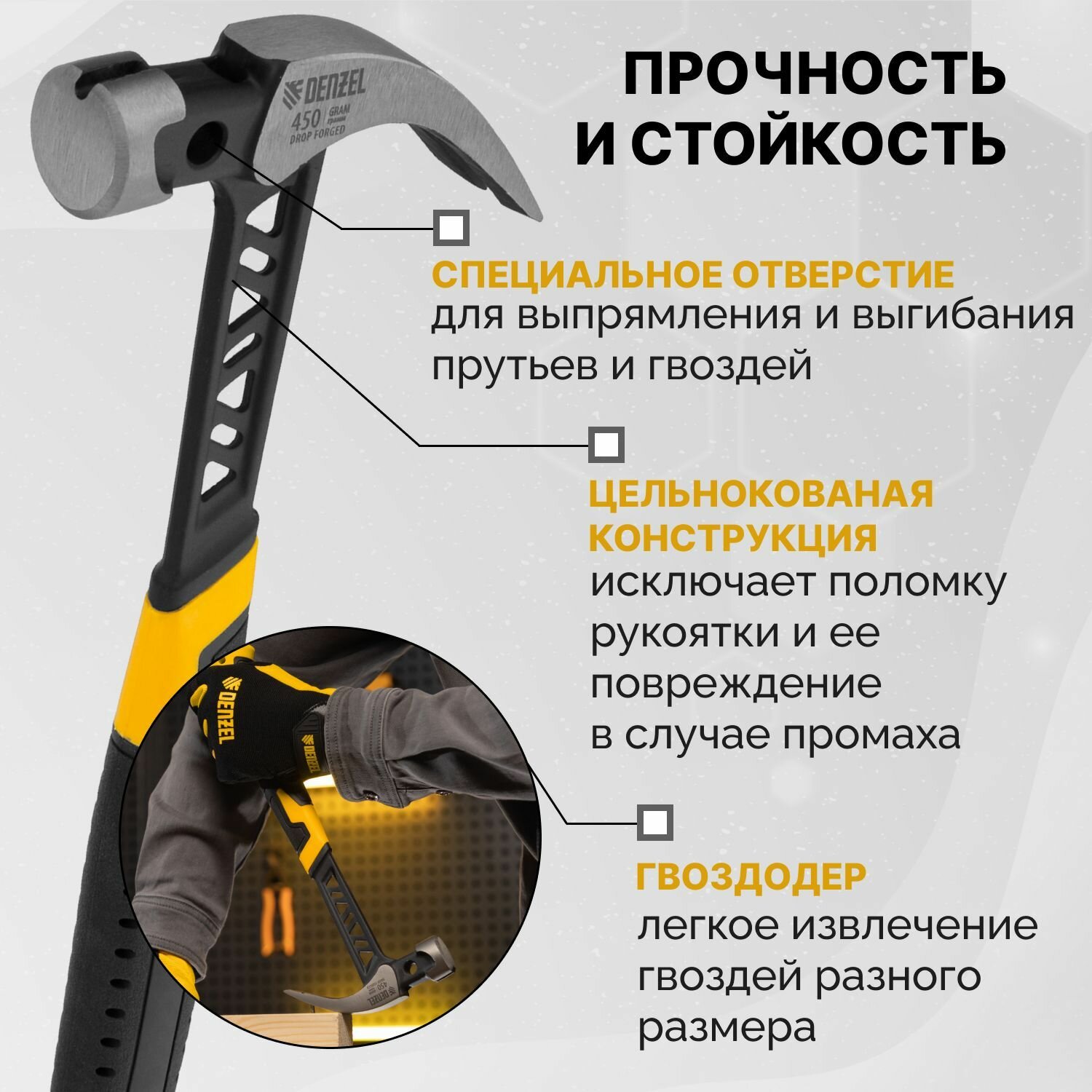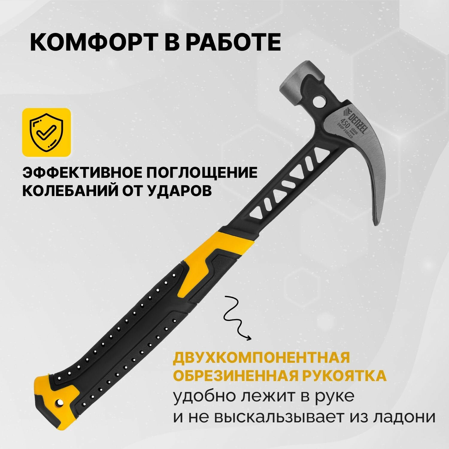 Молоток строительный, гвоздодер Denzel 10468, 450 г, цельнокованый, боек с магнитом, двухкомп. обрезиненная рукоятка