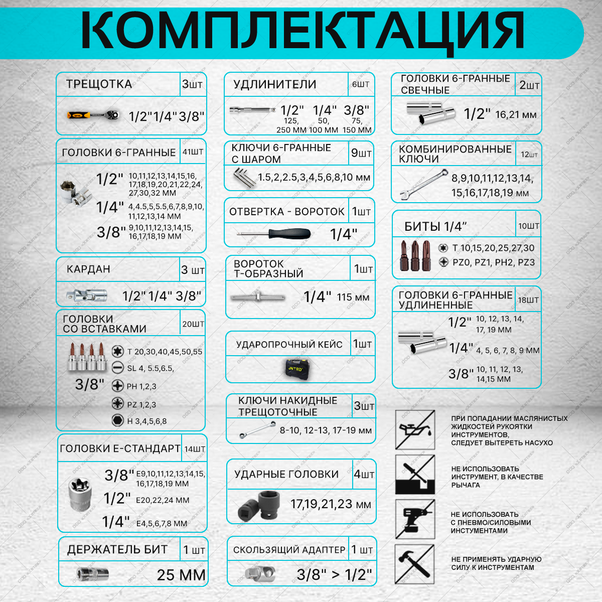 | Головки торцевые подробно | ТОРЦЕВЫЕ ГОЛОВКИ И ПРИНАДЛЕЖНОСТИ 1/2": Головки 6-гранные - 10, 11, 12, 13, 14, 15, 16, 17, 18, 19, 20, 21, 22, 24, 27, 30, 32 мм - 17 шт; Головки 6-гранные удлиненные - 10, 12, 13, 14, 17, 19 мм - 6 шт; Головки Е-стандарт - 20, 22, 24 мм - 3 шт; Головки 6-гранные ударные - 17, 19, 21, 23 мм - 4 шт;; ТОРЦЕВЫЕ ГОЛОВКИ И ПРИНАДЛЕЖНОСТИ 3/8": Головки 6-гранные - 9, 10, 11, 12, 13, 14, 15, 16, 17, 18, 19 мм - 11 шт; Головки 6-гранные удлиненные - 10, 11, 12, 13, 14, 15 мм - 6 шт; Головки 6-гранные свечные - 16, 21 мм - 2 шт; Головки Е-стандарт - 10, 11, 12, 14, 16, 18 мм - 6 шт; ГОЛОВКИ СО ВСТАВКАМИ 3/8": SLOTTED - SL4, SL5.5, SL6.5 - 3 шт; PHILLIPS - PH1, PH2, PH3 - 3 шт; POZIDRIVE - PZ1, PH2, PZ3 - 3 шт; HEX - H8, H6, H5, H4, H3 - 5 шт; TORX - T55, T50, T45, T40, T30, T20 - 6 шт; ТОРЦЕВЫЕ ГОЛОВКИ И ПРИНАДЛЕЖНОСТИ 1/4": Головки 6-гранные - 4, 4.5, 5, 5.5, 6, 7, 8, 9, 10, 11, 12, 13, 14, мм - 13 шт; Головки 6-гранные удлиненные - 4, 5, 6, 7, 8, 9 мм - 6 шт; Головки Е-стандарт - 4, 5, 6, 7, 8 мм - 5 шт; |