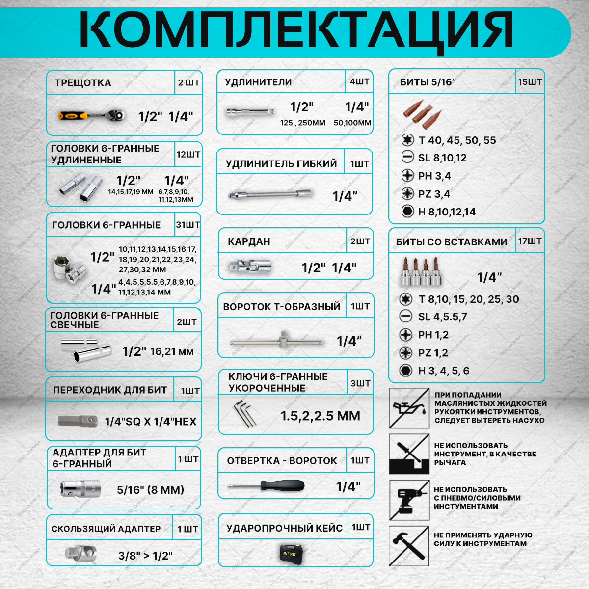 | Головки торцевые подробно | ТОРЦЕВЫЕ ГОЛОВКИ И ПРИНАДЛЕЖНОСТИ 1/2": Головки 6-гранные - 10, 11, 12, 13, 14, 15, 16, 17, 18, 19, 20, 21, 22, 23, 24, 27, 30, 32 мм - 18 шт; Головки 6-гранные удлиненные - 14, 15, 17, 19 мм - 4 шт; Головки 6-гранные свечные - 16, 21 мм - 2 шт; ТОРЦЕВЫЕ ГОЛОВКИ И ПРИНАДЛЕЖНОСТИ 1/4": Головки 6-гранные - 4, 4.5, 5, 5.5, 6, 7, 8, 9, 10, 11, 12, 13, 14 мм - 13 шт; Головки 6-гранные удлиненные - 6, 7, 8, 9, 10, 11, 12, 13 мм - 8 шт; |
