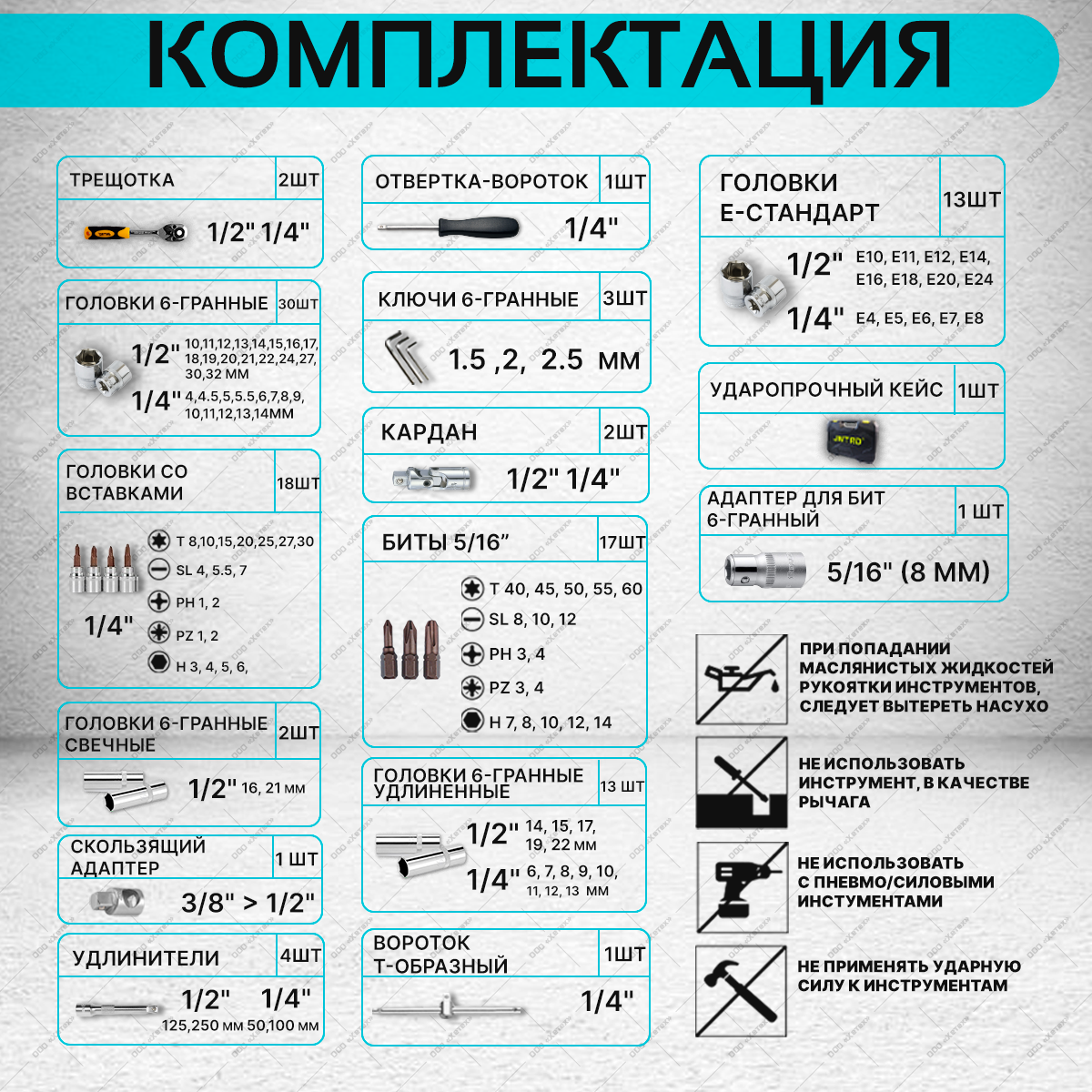 | Головки торцевые подробно | ТОРЦЕВЫЕ ГОЛОВКИ И ПРИНАДЛЕЖНОСТИ 1/2": Головки 6-гранные - 10, 11, 12, 13, 14, 15, 16, 17, 18, 19, 20, 21, 22, 24, 27, 30, 32 мм - 17 шт; Головки 6-гранные удлиненные - 14, 15, 17, 19, 22 мм - 5 шт; Головки Е-стандарт - E10, E11, E12, E14, E16, E18, E20, E24 - 8 шт; Головки 6-гранные свечные - 16, 21 мм - 2 шт;ТОРЦЕВЫЕ ГОЛОВКИ И ПРИНАДЛЕЖНОСТИ 1/4": Головки 6-гранные - 4, 4.5, 5, 5.5, 6, 7, 8, 9, 10, 11, 12, 13, 14, мм - 13 шт; Головки 6-гранные удлиненные - 6, 7, 8, 9, 10, 11, 12, 13 мм - 8 шт; Головки Е-стандарт - E4, E5, E6, E7, E8 - 5 шт; |
