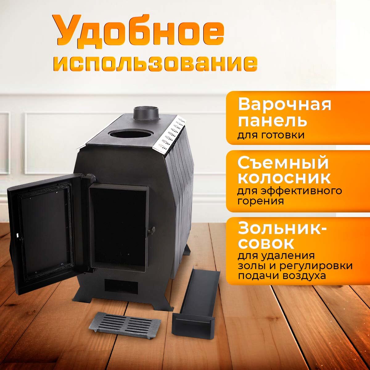 Отопительная печь дровяная с варочной панелью Kennet Ария 200 вес 77 кг (со стеклом) до 200 куб.м