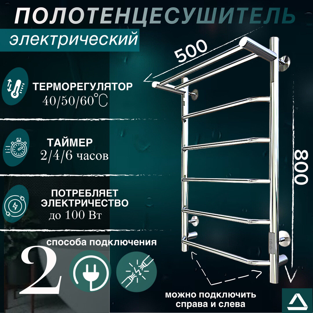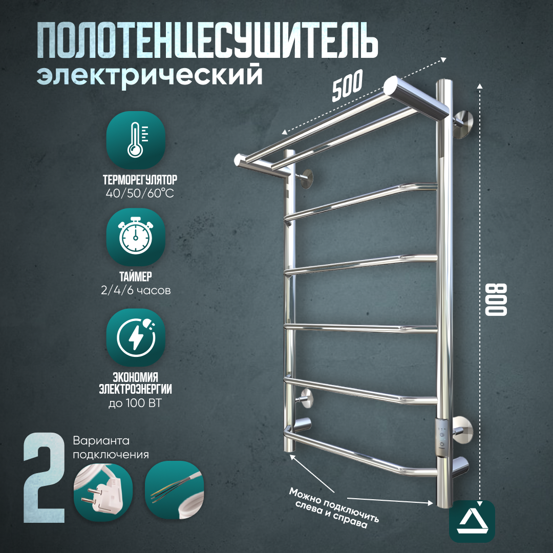 Полотенцесушитель электрический TermoPrime 500мм 800мм форма лесенка с полкой подключение слева / справа/ скрытое/ кабель с вилкой интересное: