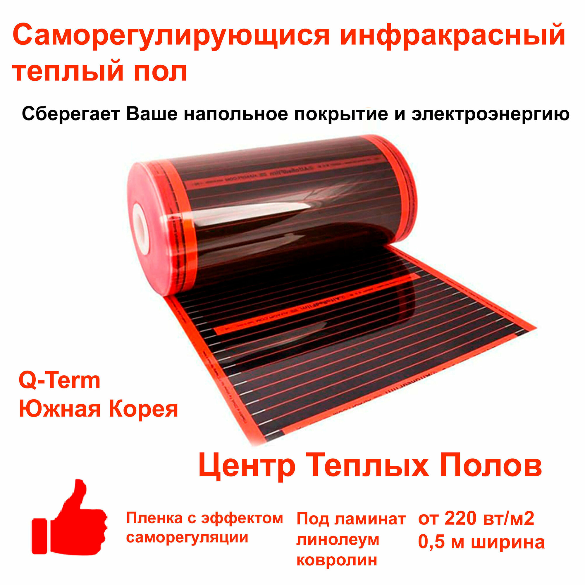 Саморегулирующийся инфракрасный пленочный теплый пол электрический под ламинат и линолеум Q-Term ширина 0,5 м длина 2 м интересное: