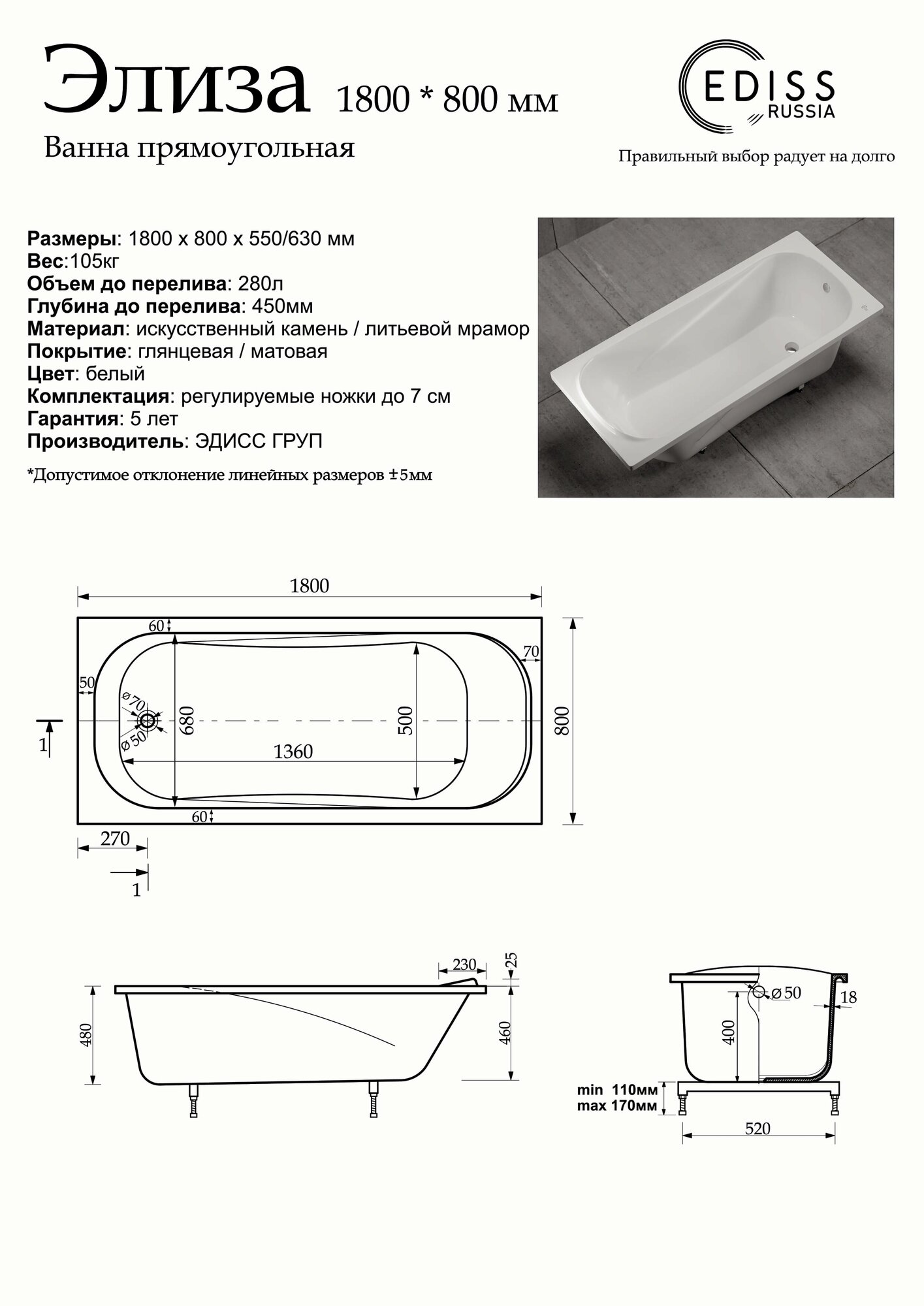 Ванна из литьевого мрамора Ediss Элиза 1800х800мм (в комплекте ножки) интересное: