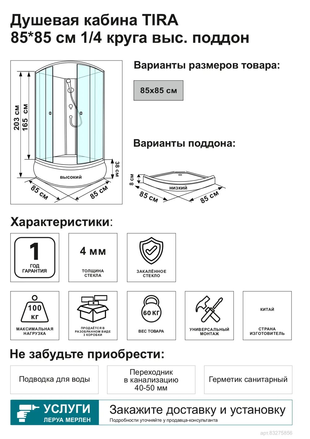Душевая кабина Tira Next высокий поддон 85x85 см интересное: