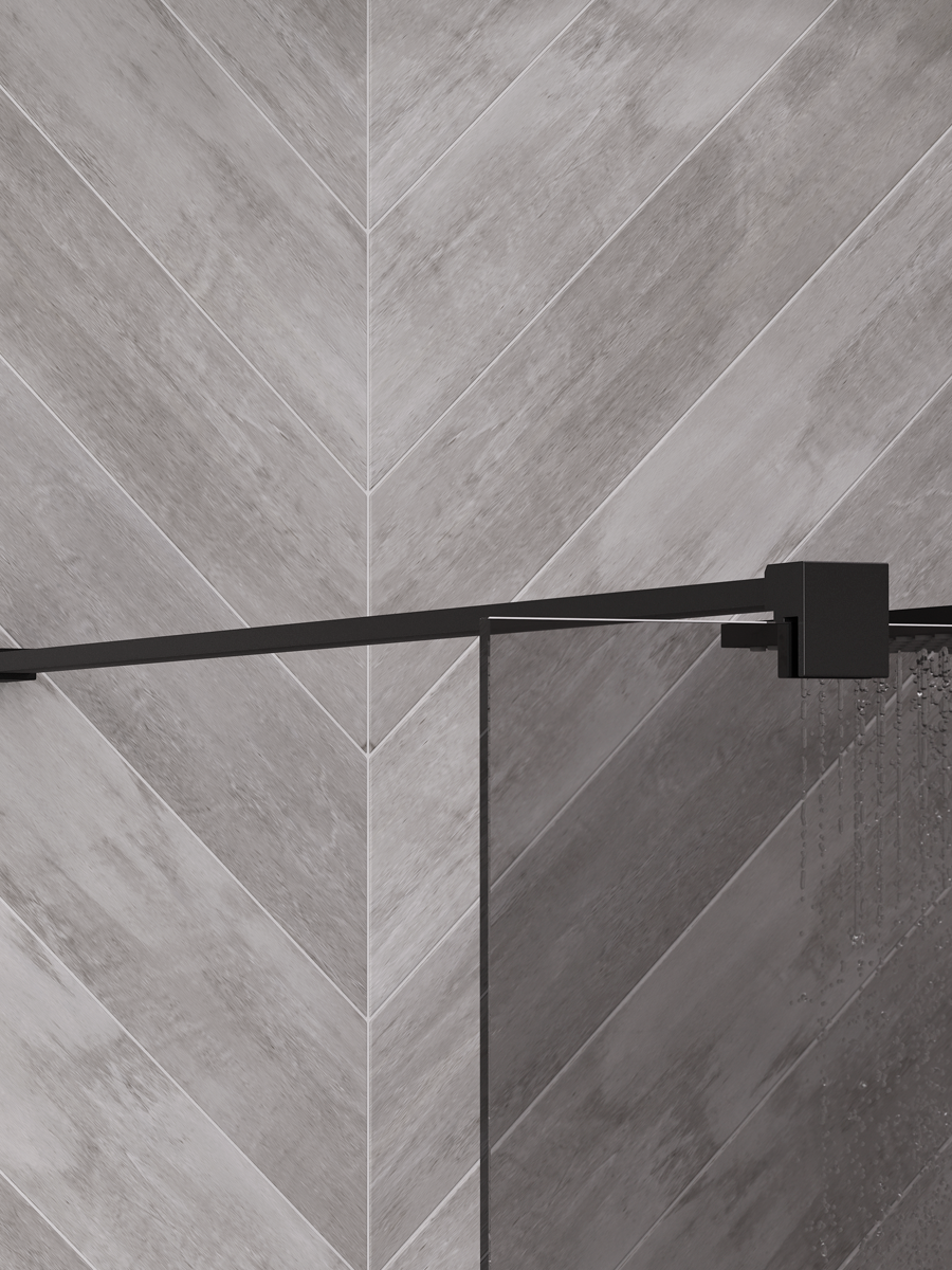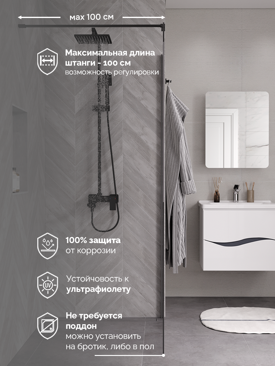 Душевое ограждение перегородка Reflexion RX20090CBL-14 Walk in 200x90 см, прозрачное закаленное стекло 8 мм, черный профиль